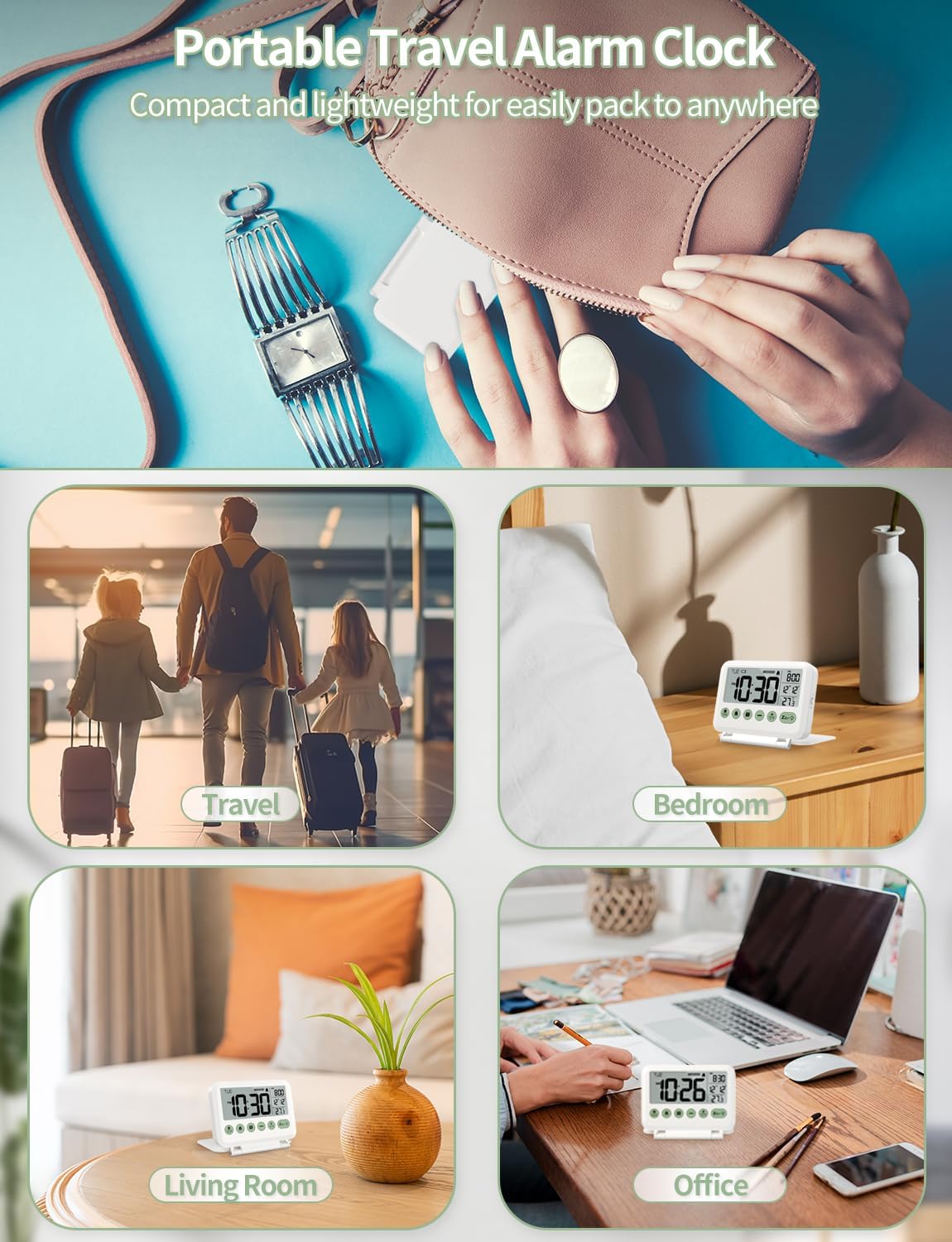 Digital Travel Alarm Clock - 3.54 inch LCD Display, 9-Minute Snooze, 2 Volume Levels, Backlight, Battery Included (White)