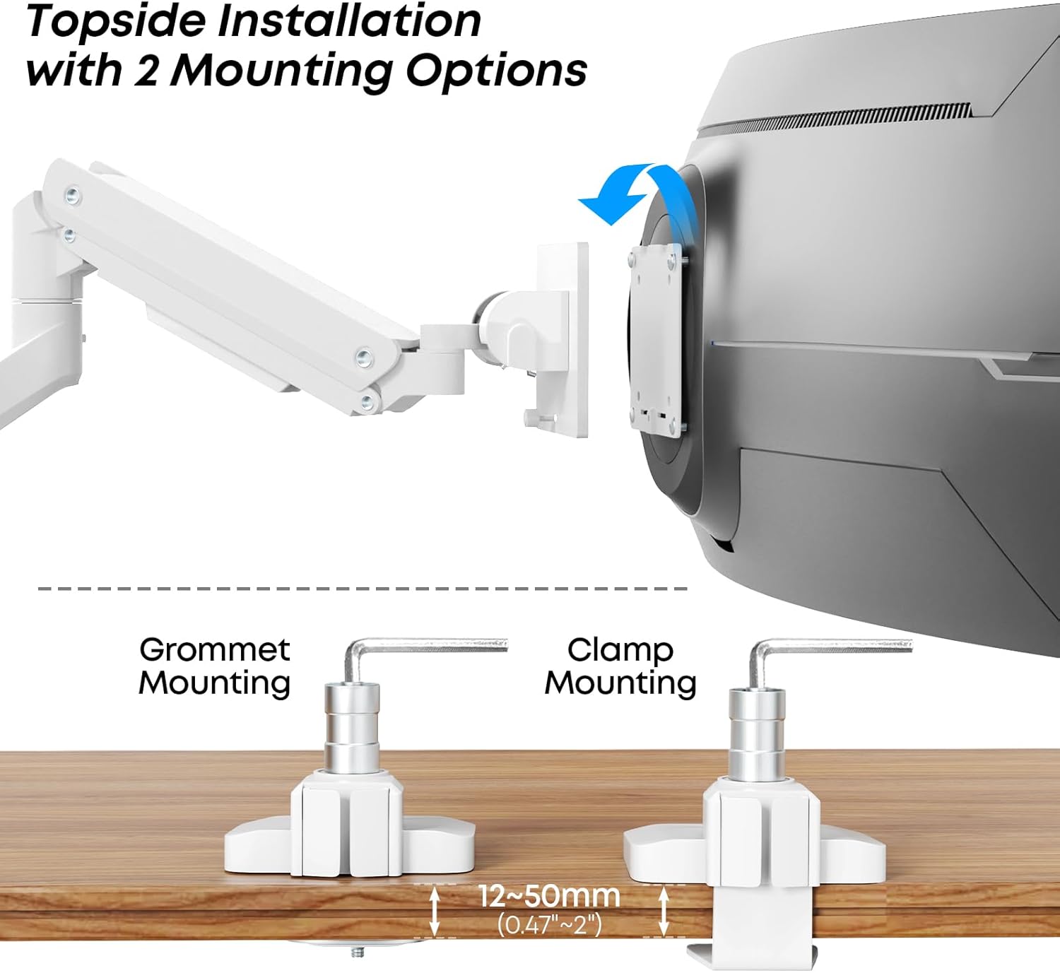 Premium Heavy Duty Monitor Arm for 17 to 49 inch Screens up to 44lbs, Fully Adjustable Ultrawide Single Clamp-on Desk Mount Stand, VESA 75x75/100x100mm (White)