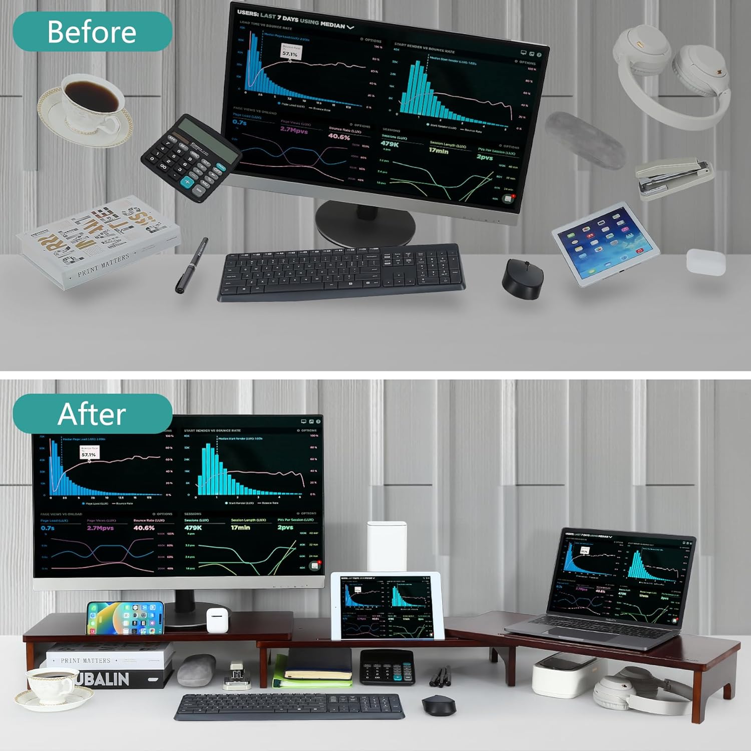 - 【Details Design for Use】Each computer monitor stand has a wide and deep tablet holder in the front of the top. The monitor shelf for desk fits for pencils or phone.Also there is a cut on the back,so the cables won't be easily in a mess or become an obstacle between wall and the shelf.Moreover, the leg base is attached with anti-slip mat, enhancing the stability of the stand.If you have any problems with the assembly, please consult us!