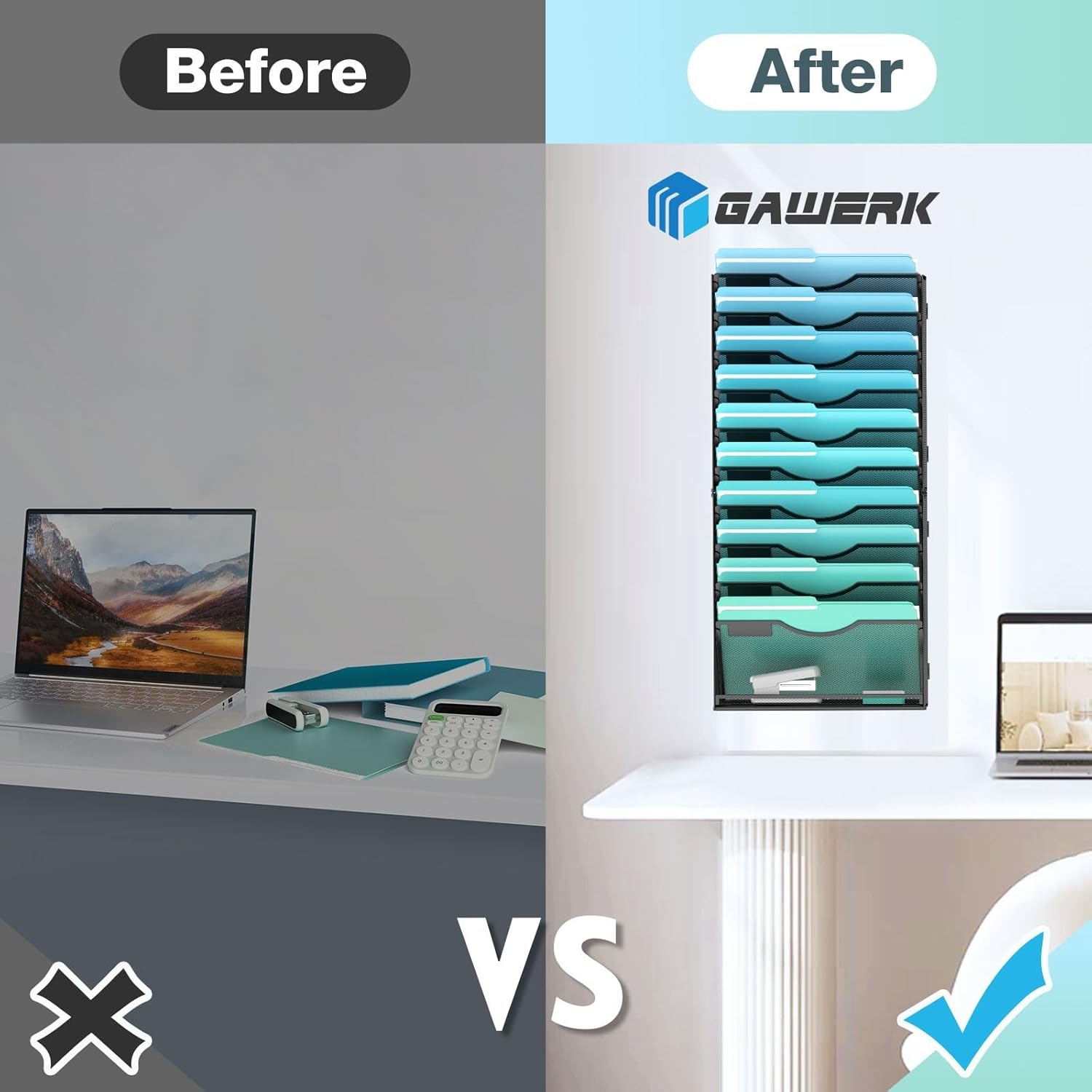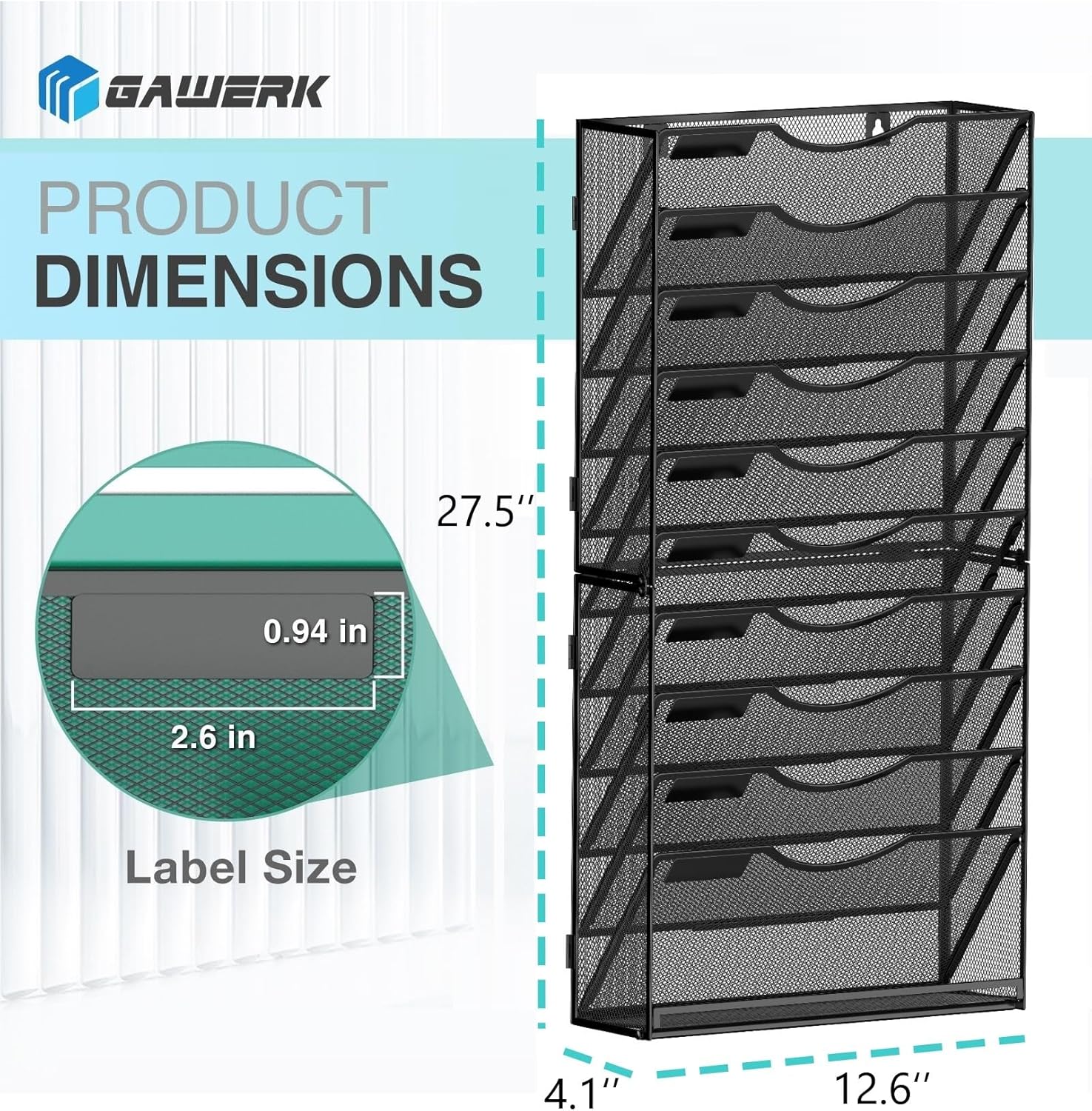 - Easy to Install - This mail organizer wall comes with mounting screws, you only need to drill 2 holes to mount it to the wall. And Our 11-tier wall paper organizer has an elegant look design with upgraded powder coat finish, anti-oxidation and anti-rust, which is enough for many years.