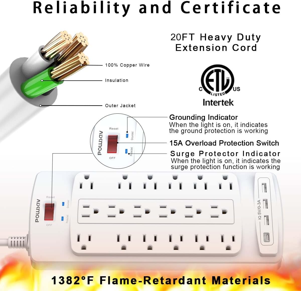 18 Outlets Surge Protector Power Strip - 20 Feet Flat Plug Heavy Duty Extension Cord with 18 Widely Outlets and 4 USB Ports, 2100 Joules, White, ETL Listed