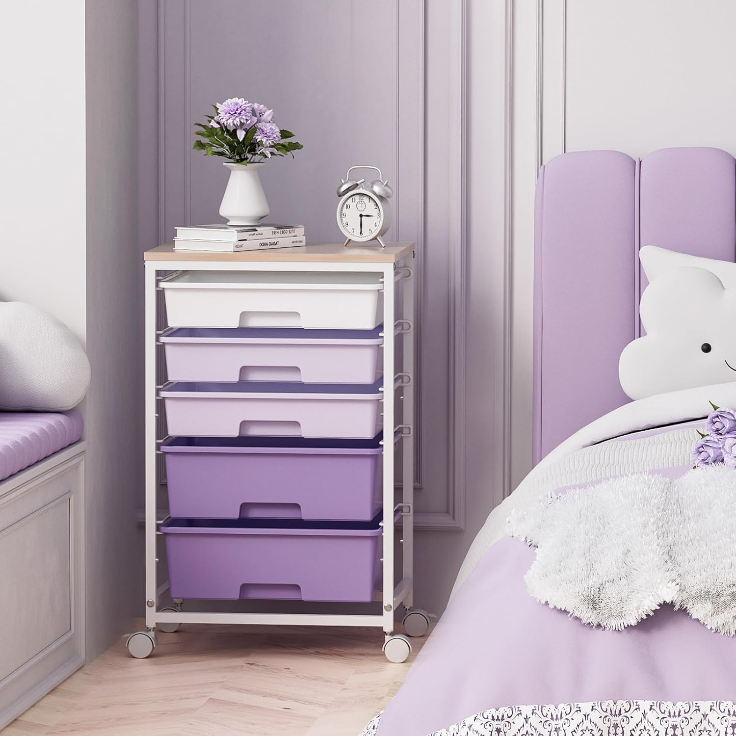 Utility Cart with 5 Drawers,Storage Drawer Cart with Wooden Tabletop and Lockable Wheels,Craft Storage Trolley Cart,5-Tier Rolling Utility Cart on Wheels,Purple