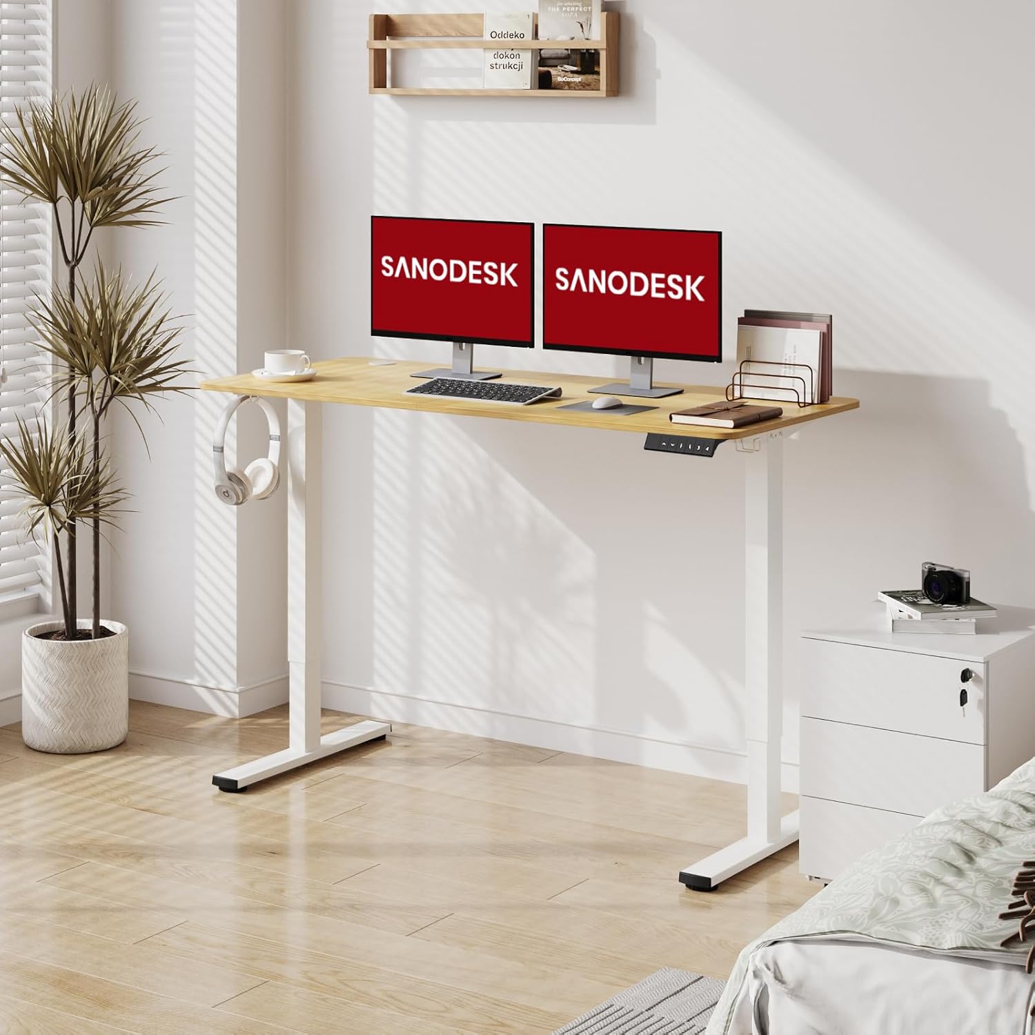 SANODESK Electric Standing Desk 63x24 Inch Height Adjustable Stand Up Desk Home Office Computer Workstation Sit Stand Home Office Desk with Splice Board (White Frame + Maple Top)