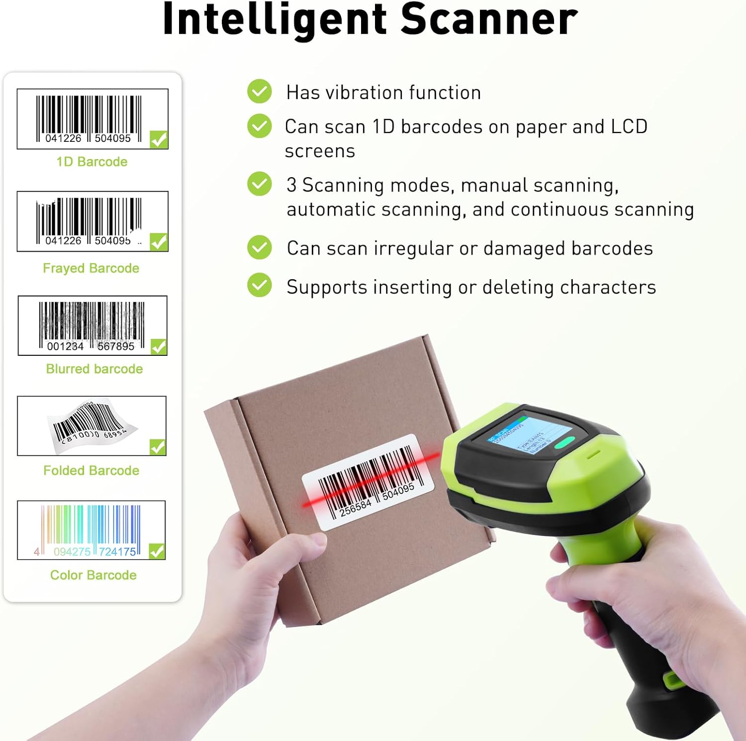 Barcode Scanner Wireless, 1D CCD Automatic Bar Code Scanner with Display Screen, Rechargeable Handhold Barcode Reader with 2.4G Receiver & USB Wired Plug and Play (Green)
