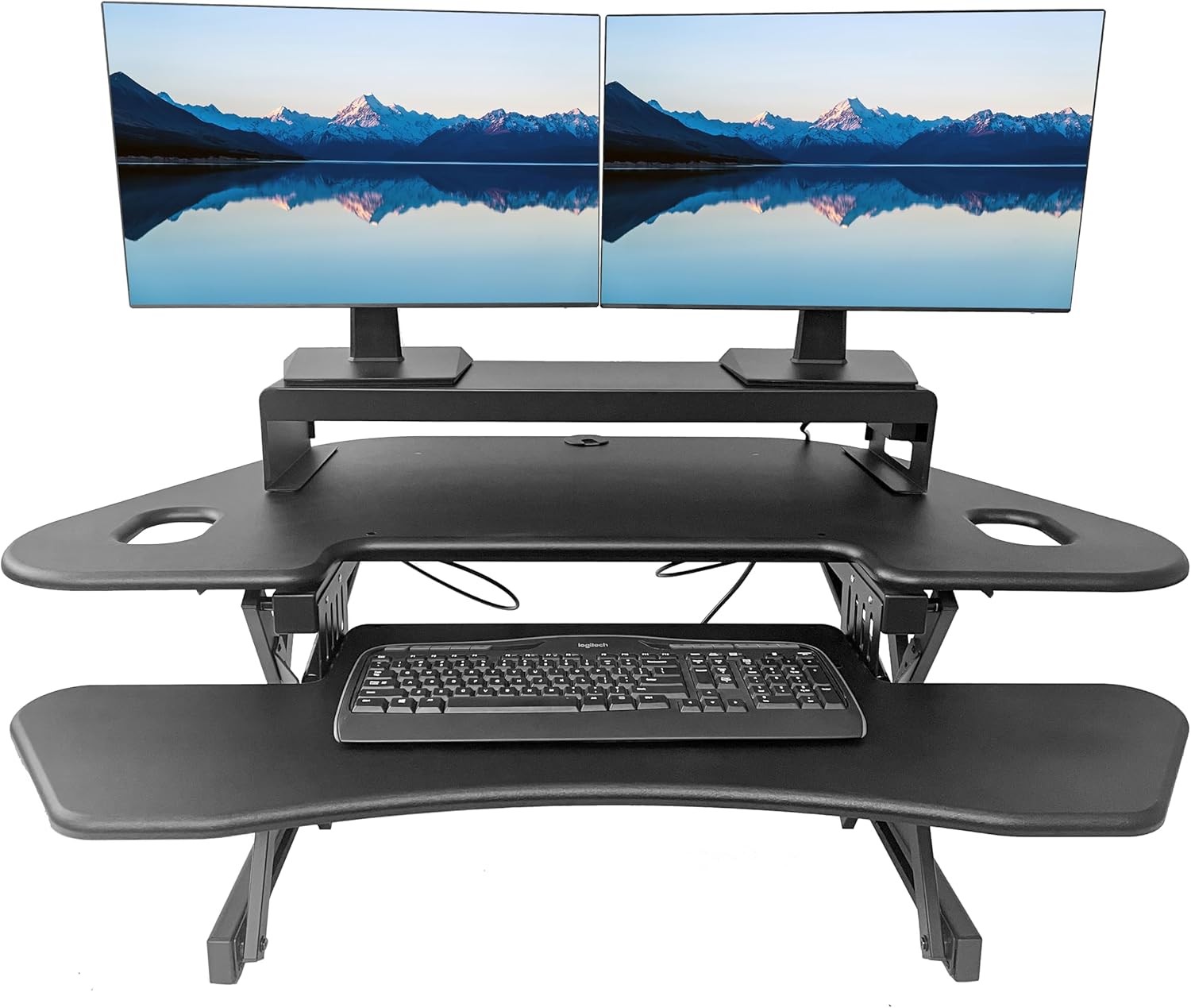 Rocelco 46" Height Adjustable Corner Standing Desk Converter with AC Outlet USB Charger and Dual Stand - Tabletop Computer Riser Workstation - Large Keyboard Tray - Black (R CADRB-46-ACUSB-DMS)
