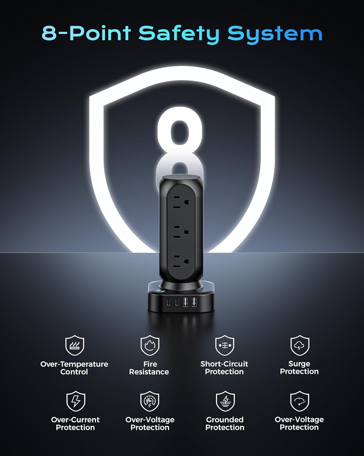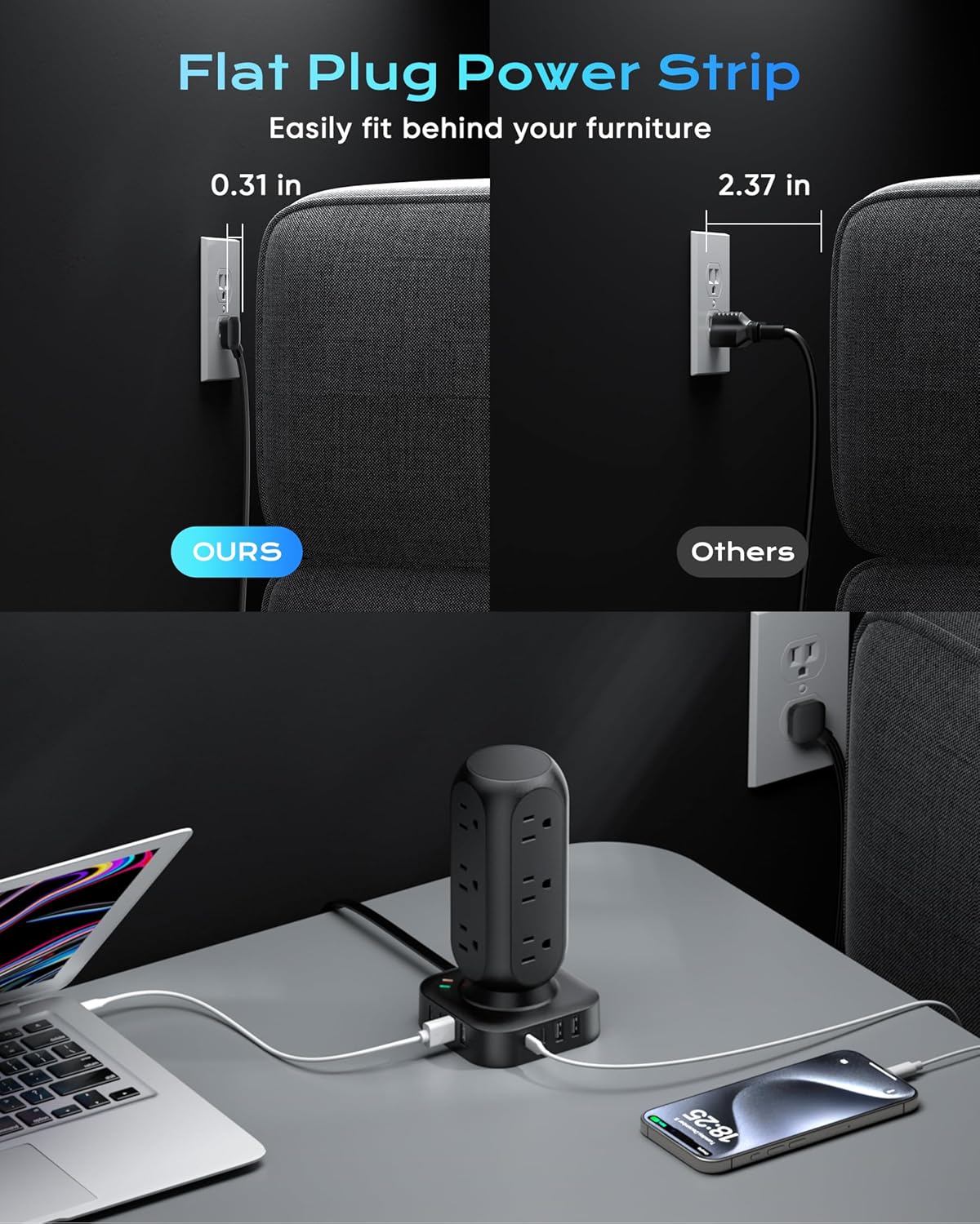 - 【20 IN 1 Power Strip Tower with USB】- This vertical power strip with USB ports features 12 AC outlets and 8 smart-charging USB ports(4 USB-C). It can charge 20 devices simultaneously without blocking, keep your desktop organized, widely use in home/office/dorm room. (Note: Please do not exceed the rated power 1875W ).