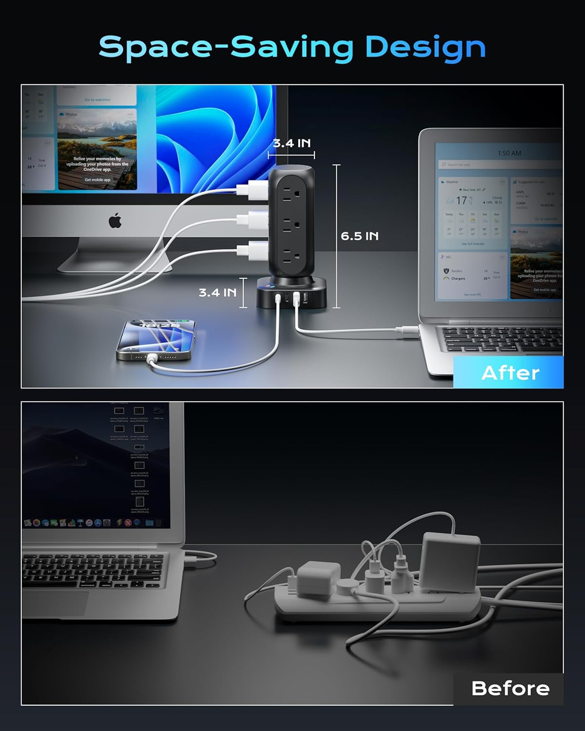 - 【Space-Saving and Lightweight 】- This charging tower has a compact size (3.4*3.4*6.5 in), only takes up little space on your desk. Small and lightweight design, easy to carry and great for travel. With 4 rubber feet at the bottom, efficiently keeps from sliding and falling down.