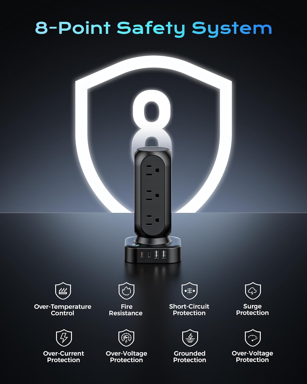 - 【20 IN 1 Power Strip Tower with USB】- This vertical power strip with USB ports features 12 AC outlets and 8 smart-charging USB ports(2 PD 20W USB-C).It can charge 20 devices simultaneously without blocking, keep your desktop organized, widely use in home/office/dorm room. (Note: Please do not exceed the rated power 1875W ).