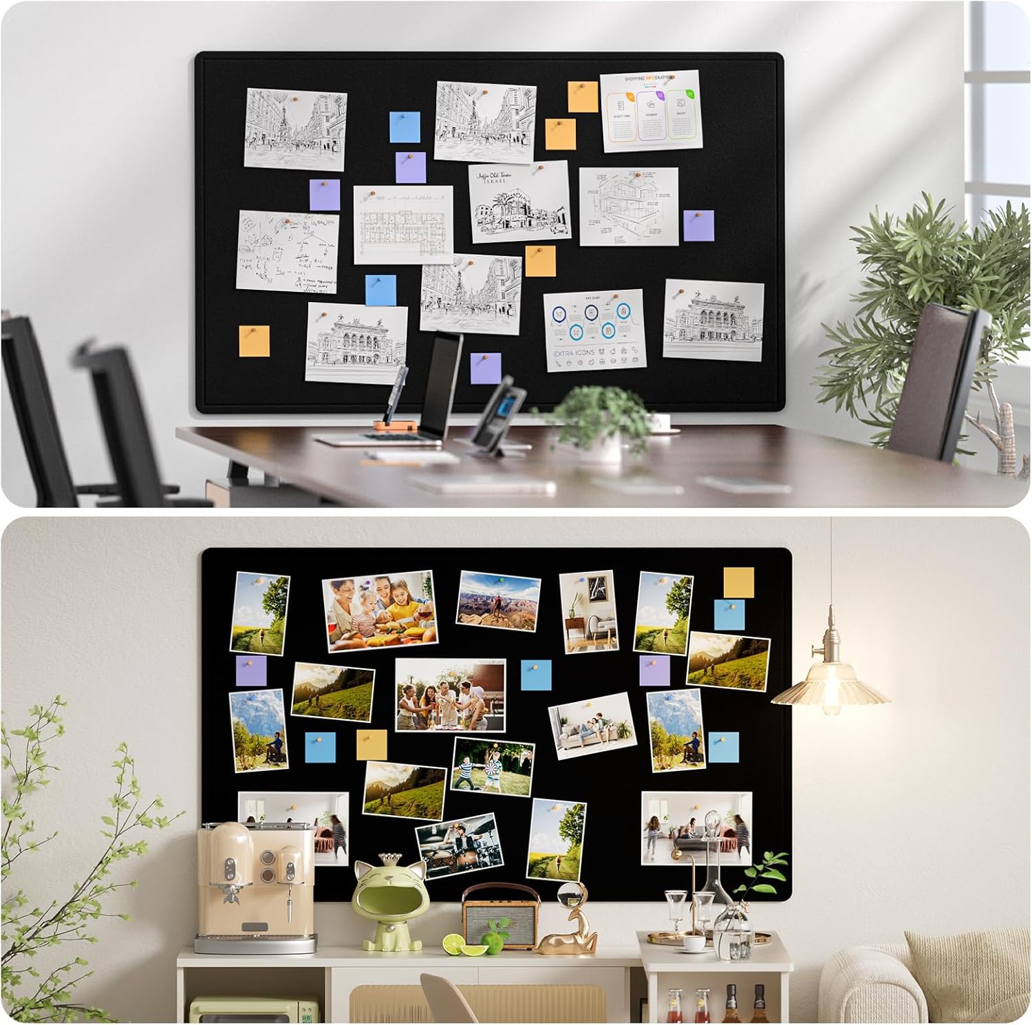 - WIDE APPLICATION: Perfect for displaying pictures, notes, schedules, and reminders, this bulletin board can also serve as large-area decoration and wall protection. It suits various scenes like office backgrounds, homes, kitchens, jewelry storage, and tool storage. Customize it to your needs, whether as planning boards, message boards, notice boards, DIY vision boards, picture boards, or mood boards. The different color options seamlessly blend practicality with aesthetics, enhancing any space.