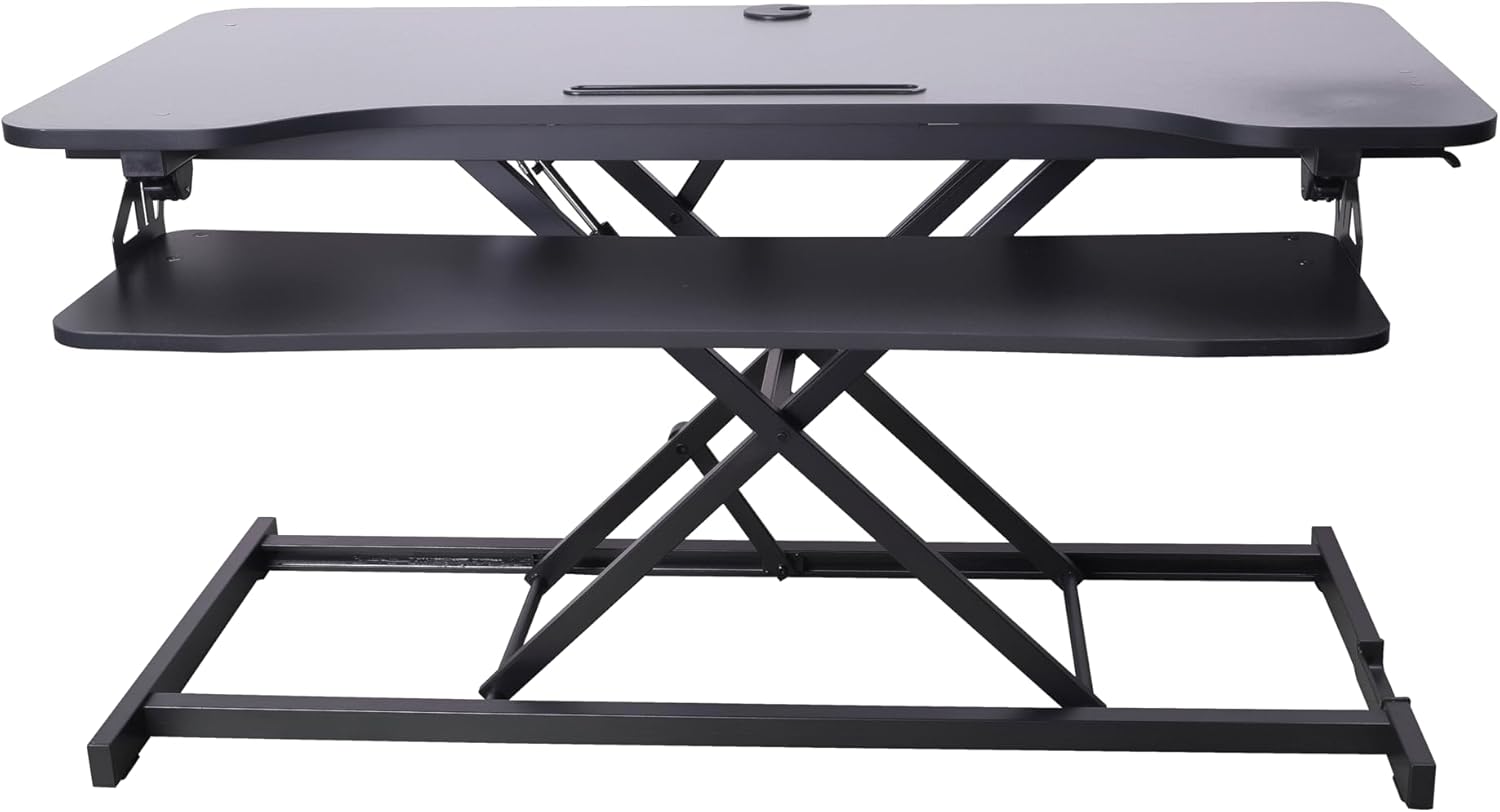 - Large Work Surface - 43" wide by 20.5" deep desktop can hold up to two 32" monitors, while 35" wide by 10" deep detachable keyboard tray will hold a laptop and keep arms in ergonomic position to prevent strain while sitting or standing.