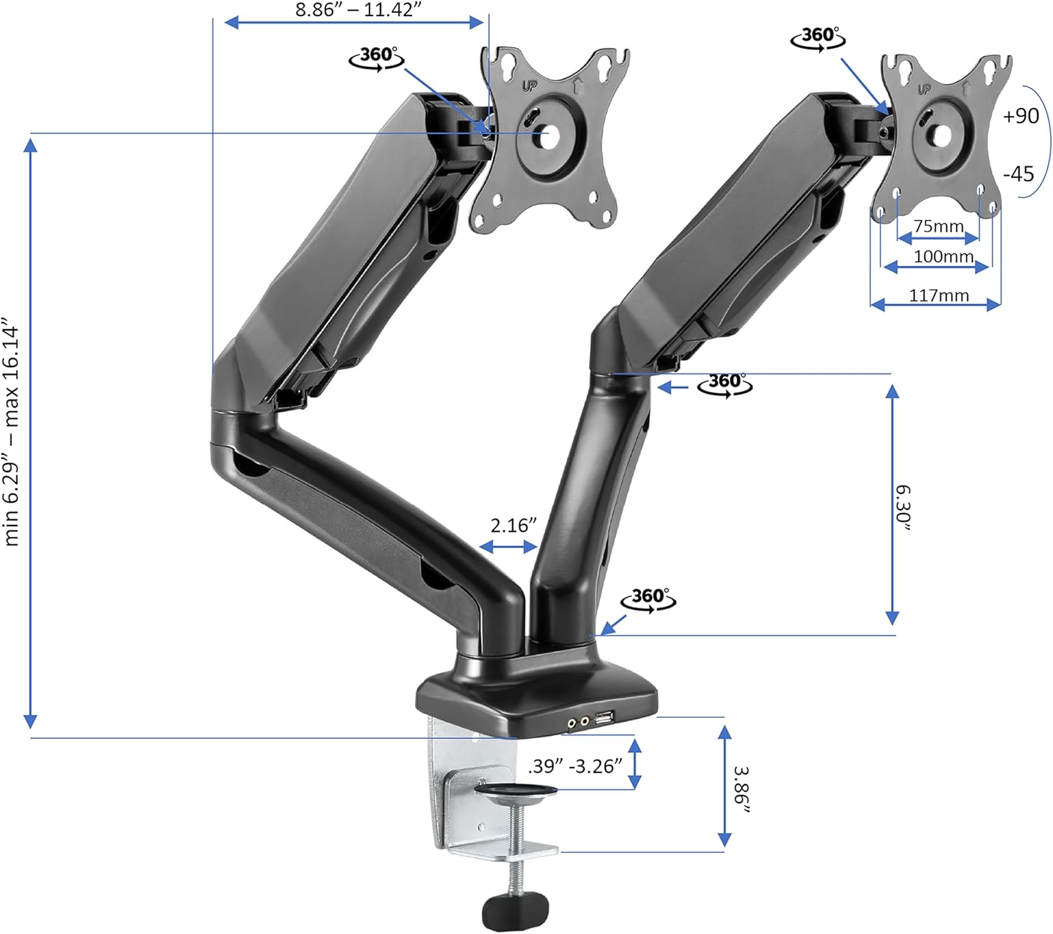 - Quick, easy and stable height adjustment - Sturdy metal frame with easy-grip side handle and gas piston assist, can raise and lower up to 33 pounds from 4" up to 21.7" above desktop. Straight up and down motion minimizes required depth (18.5").