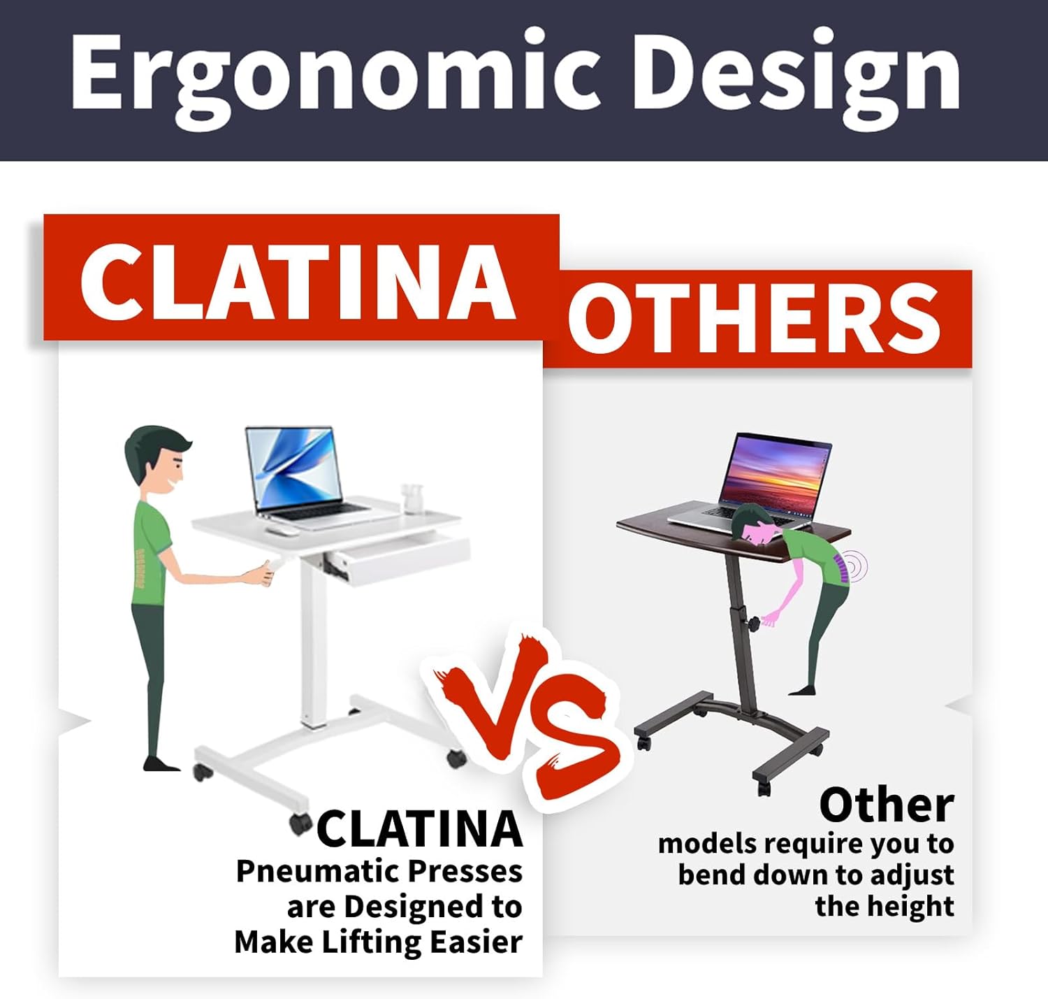 - 【EASY TO INSTALL & PROFESSIONAL】: No need for extra mounting tools. We provide detailed manual and all the necessary hardware to help assemble this mobile laptop desk more quick and efficient. we provide worry-free 3-year warranty, and friendly customer service. Come and experience this CLATINA multifunctional mobile standing desk.