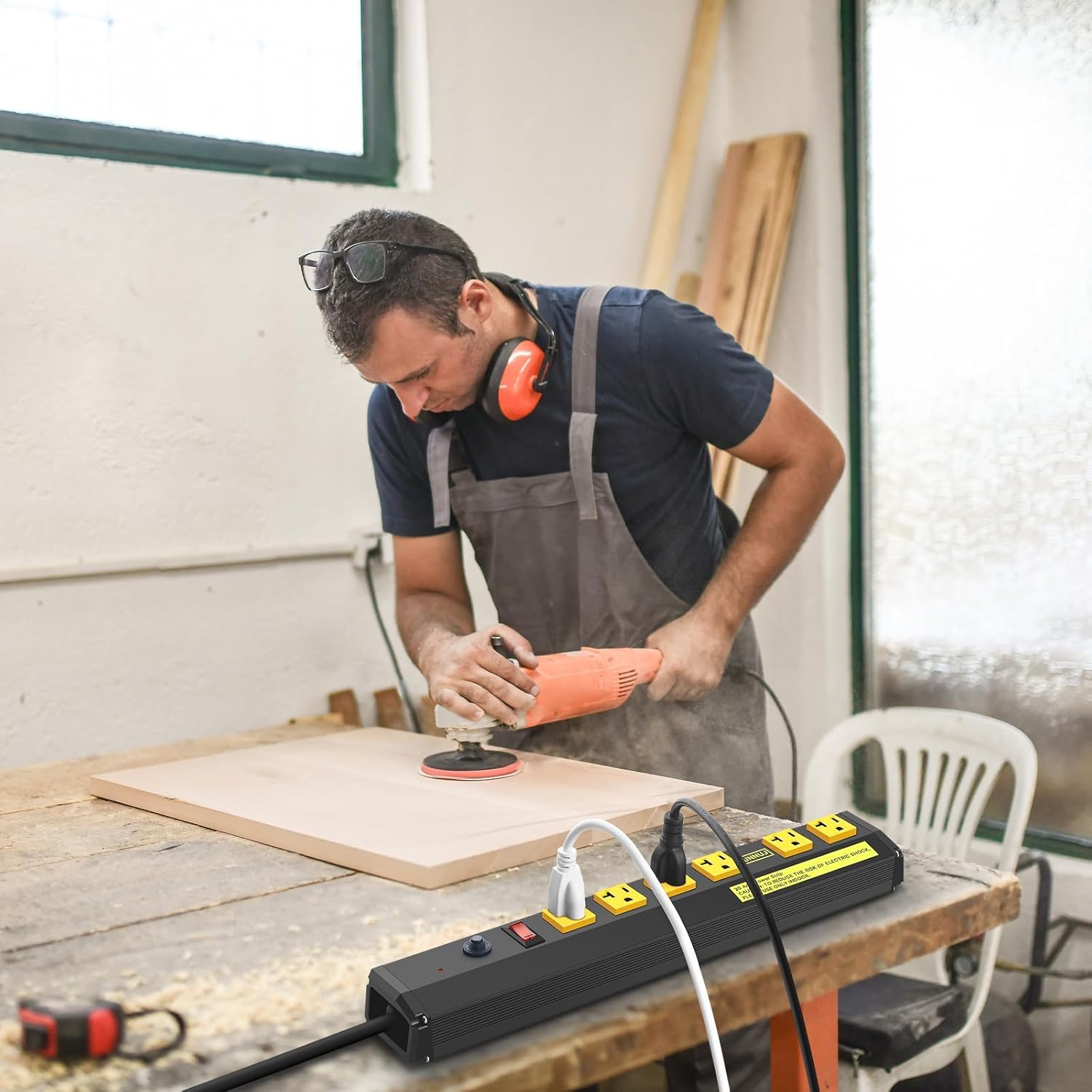 JUNNUJ Heavy Duty Metal Power Strip 20 Amp, High Amp Surge Protector 6 Outlet, 20A Power Strips Workshop Industrial Outlets Wide Spaced 6-20R T-Slot with Circuit Breaker, 12 Gauge Extension Cord 15ft