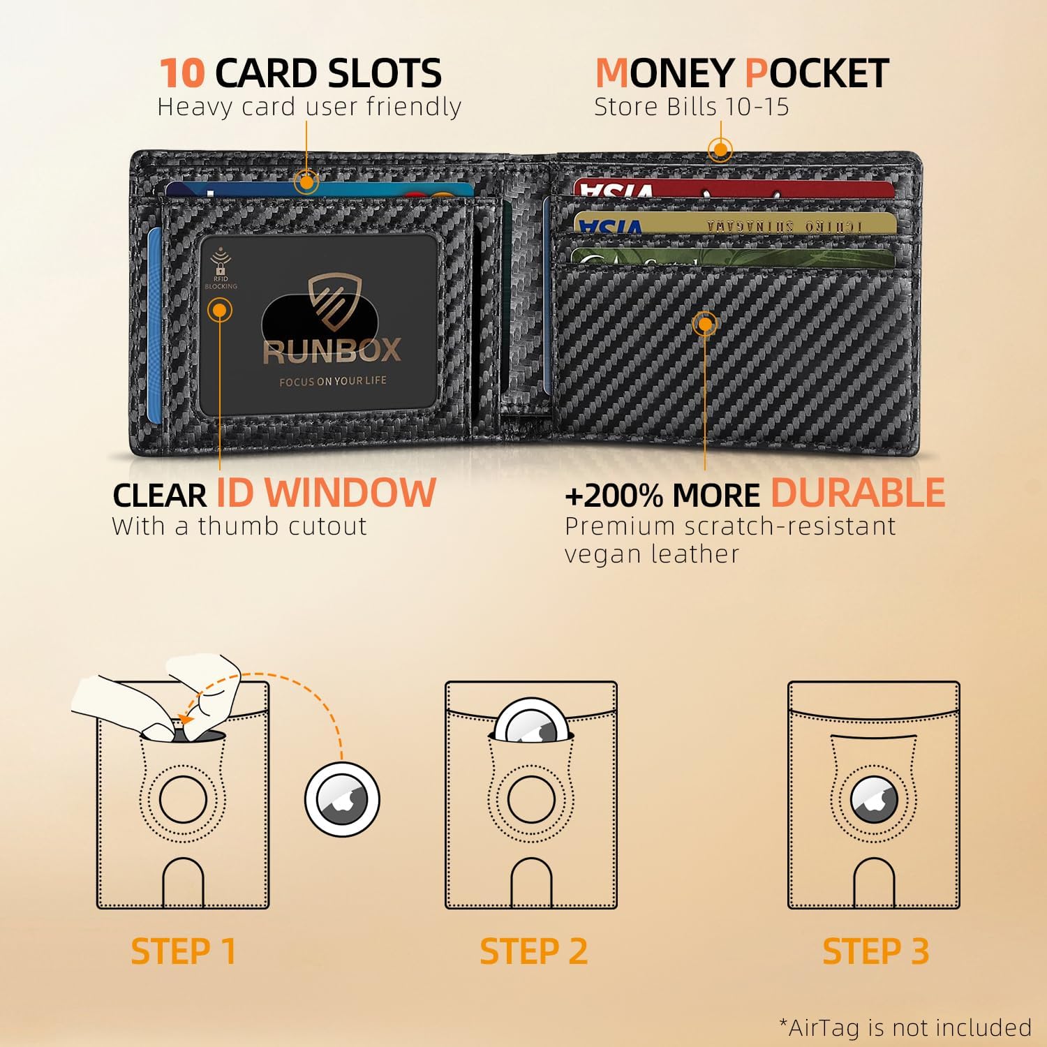 RUNBOX AirTag-Wallet-Mens-Slim-RFID Blocking Wallets Leather with Bill Compartment Air Tag Bifold Card Holder Wallet Gifts for Men Dad