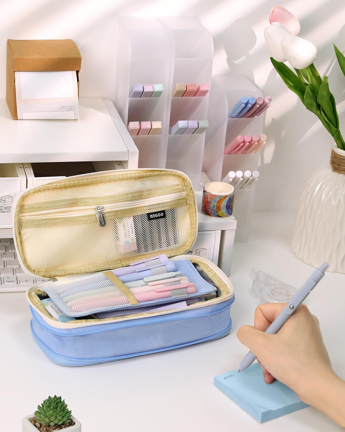 - 【Large capacity】 Pencil case size 8.66 x 4.13 x 2.56 inches with large capacity storage, can store up to up to 50 pens or 90 pencils, and can store small stationery in the mesh bag.