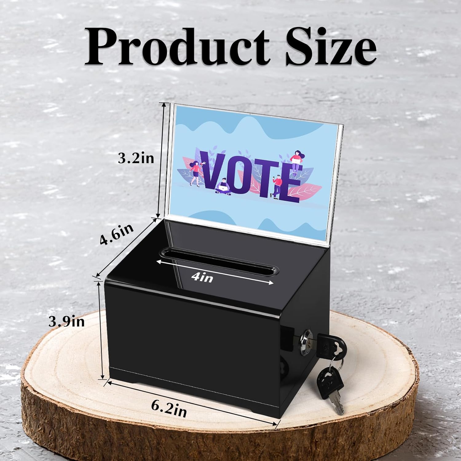 - 【Package Include】You will receive 1 pack acrylic donation boxes with 1 pack Detachable Sign Holder, suggestion box measure 6.2x4.6x3.9inch, The removable sign holder on the top of the ballot box has dimensions of 6.2x3.2inch,enough to meet your daily needs.Tips: To prevent the key from scratching the surface of the plastic lottery box, we put the key inside the box. When you receive the product, open the box first to get the key.
