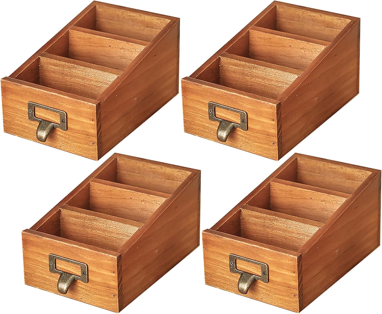 3-Slot Wooden Desk Organizer - Card Catalog Drawer Style Storage Box for Stationery & Office Supplies - Remote Caddy, Phone Stand, or Pencil Holder for Desk - Cubicle Accessories (4-Pack)