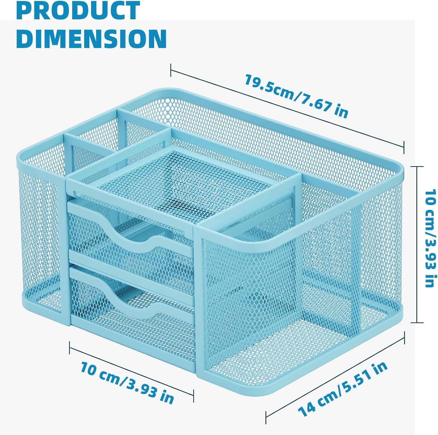 Marbrasse Mesh Desk Organizer, Pen Organizer with 2 Drawer, Multi-Functional Pencil Holder, Desk Organizers and Accessories with 5 Compartments + Drawer for Office Art Supplies (Blue)
