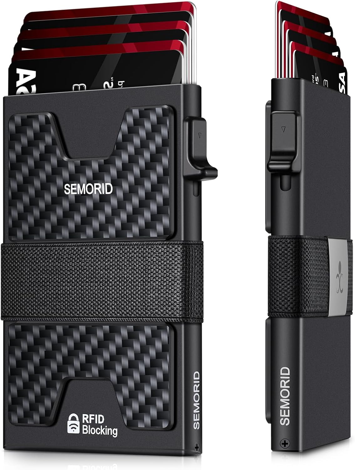 Slim Wallet for Men, Minimalist RFID Blocking Mens Wallet with Pop Up Case, Thin Metal Credit Card Holder with Cash Strap & Expandable Backplate - Holds 12 Cards