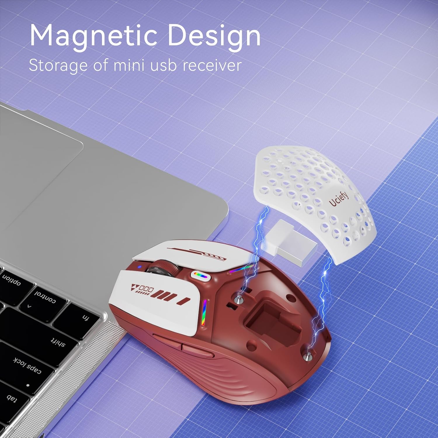 - INNOVATED HONEYCOMB & MAGNETIC COVER DESIGN:The honeycomb & magnetic cover design of the back shell of the mouse not only has a beautiful and unique mecha-style appearance but also has a very practical function with breathable heat dissipation, and the USB receiver is stored in the mouse and just needs to remove the magnetic cover and take out. It's convenient, and don't worry about losing your mini USB receiver.
