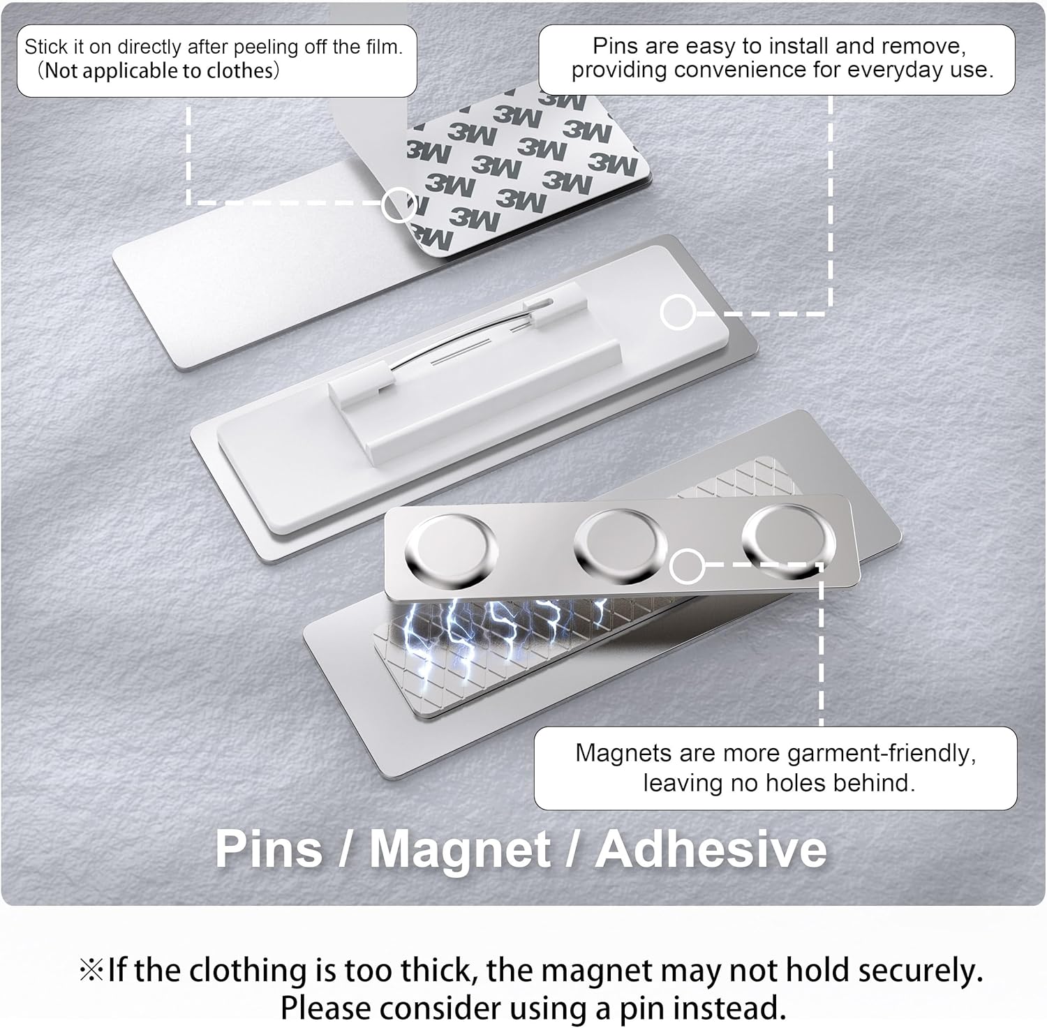 - Versatile and Convenient: These name tags offer three convenient attachment options - pins or magnets or adhesive . You can easily attach them to your clothing or accessories, depending on your preference. Whether you prefer the traditional pin attachment or the hassle-free magnetic option, our name tags have you covered.