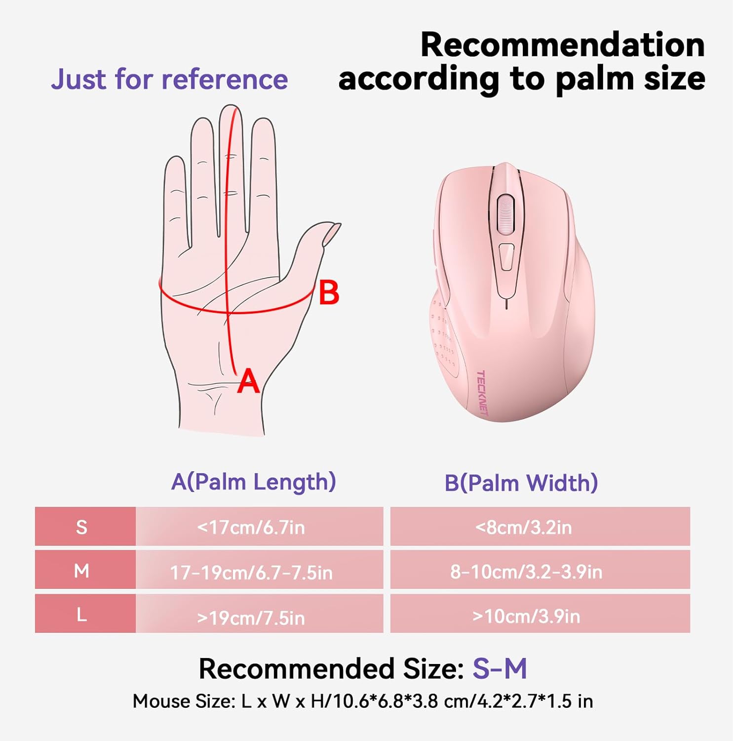 TECKNET Wireless Mouse (BT5.0/3.0 & 2.4G) Rechargeable 4800 DPI Silent USB A & Bluetooth Mouse 6 Buttons, Wide Compatibility - Pink