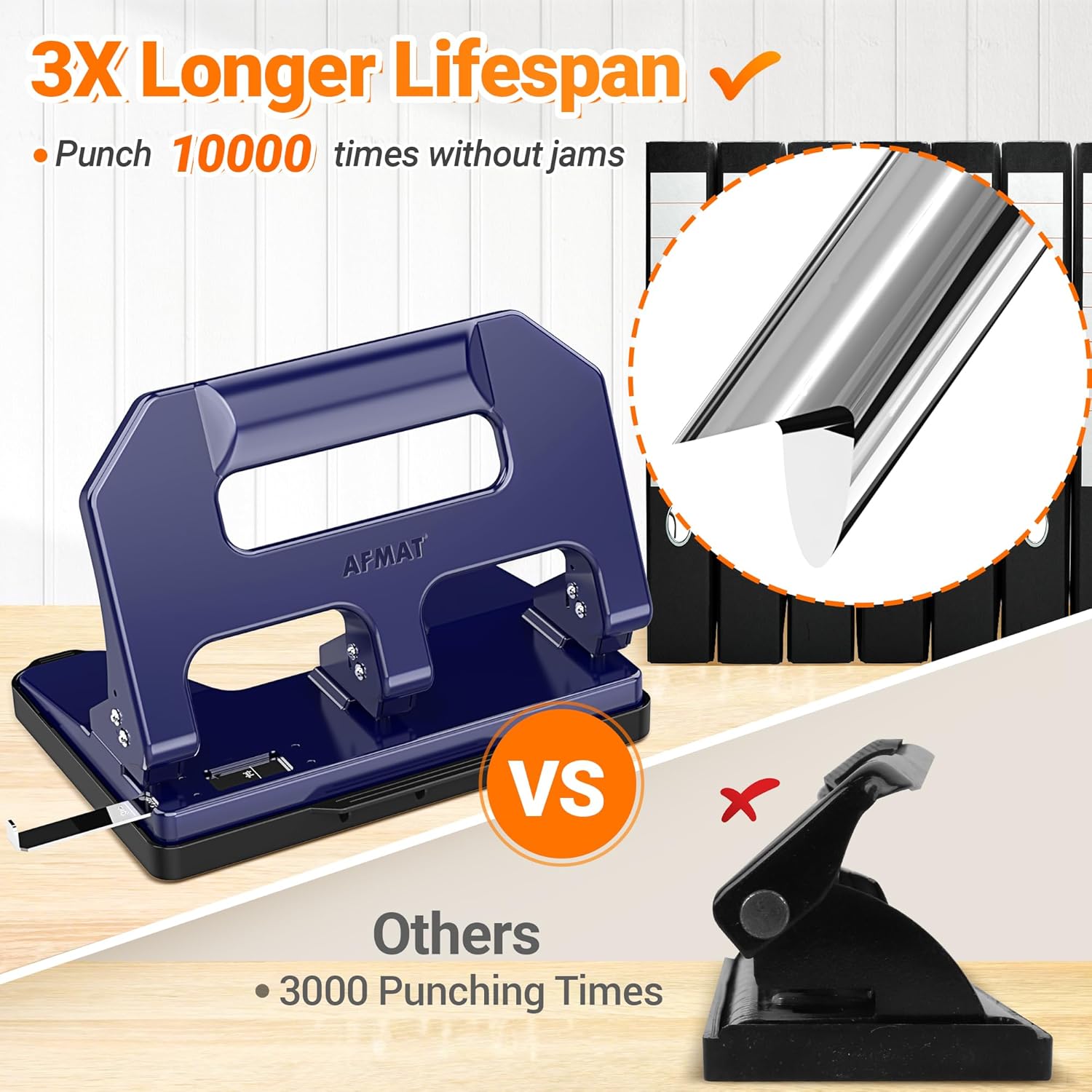 - 50% Less Effort Needed: If you have to punch large stacks of paper everyday, especially when you suffer from arthritis, you need a labor-saving hole punch. AFMAT 3 hole punch, with the optimized labor-saving lever structure (the effort arm is much longer than the load arm), can get the job done with minimum hand pressure, which is 50% LESS than the regular paper puncher you used to struggle with.