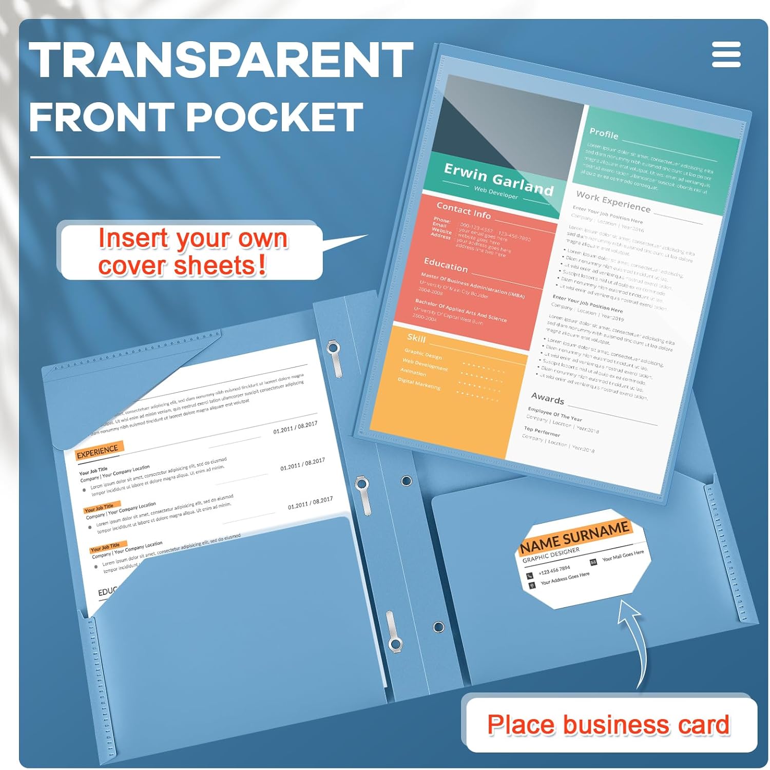 - Practical and Useful: with a clear front pocket, you can put your catalog, tables, favorite reports, presentations and more for clear display; Each plastic folder has 2 internal pockets to help organize and store your letter sized paper and documents, there are also 3 prongs to secure your 3-hole loose leaf paper, and the card slot can hold your ID card or business card, practical for your daily work