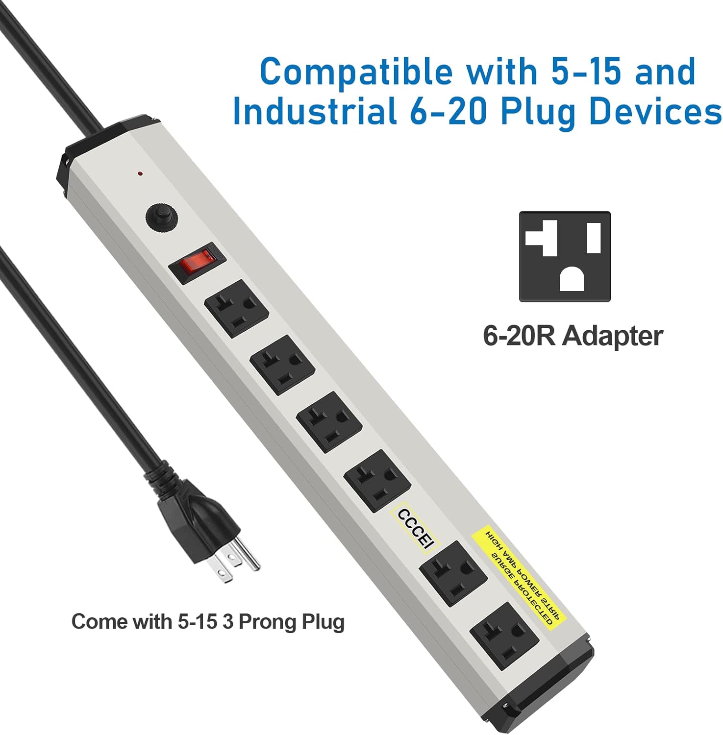 CCCEI Heavy Duty Power Strip Surge Protector 20 Amp, High Amp Industrial Shop Garage Metal Multiple Outlets, 12 FT 12 Gauge 5-15P Extension Cord 6 Outlet 6-20R T-Slot 20a for Appliance.