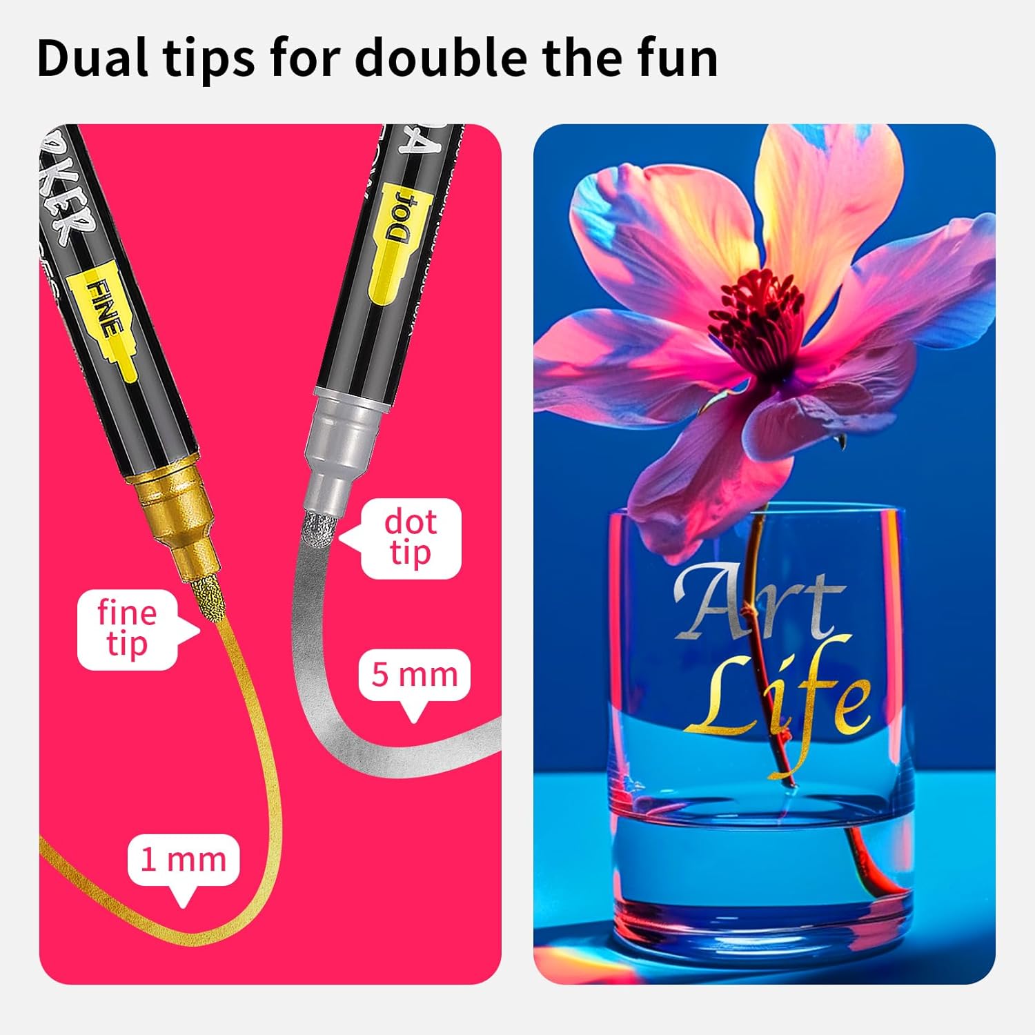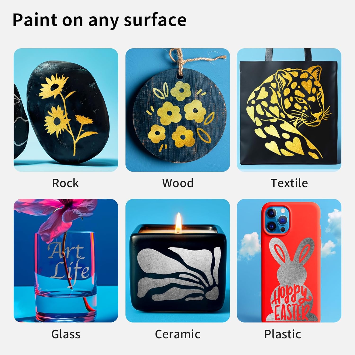 - PREMIUM QUALITY: This gold and silver paint pens features high-quality acrylic paint and a durable nib that dries opaque, so you don’t have to make a second layer! The gold permanent paint marker is acid-free, waterproof and wear resistant. It’s a great tool for art projects, DIY crafts, coloring, greeting cards, poster making, painting, highlighting.