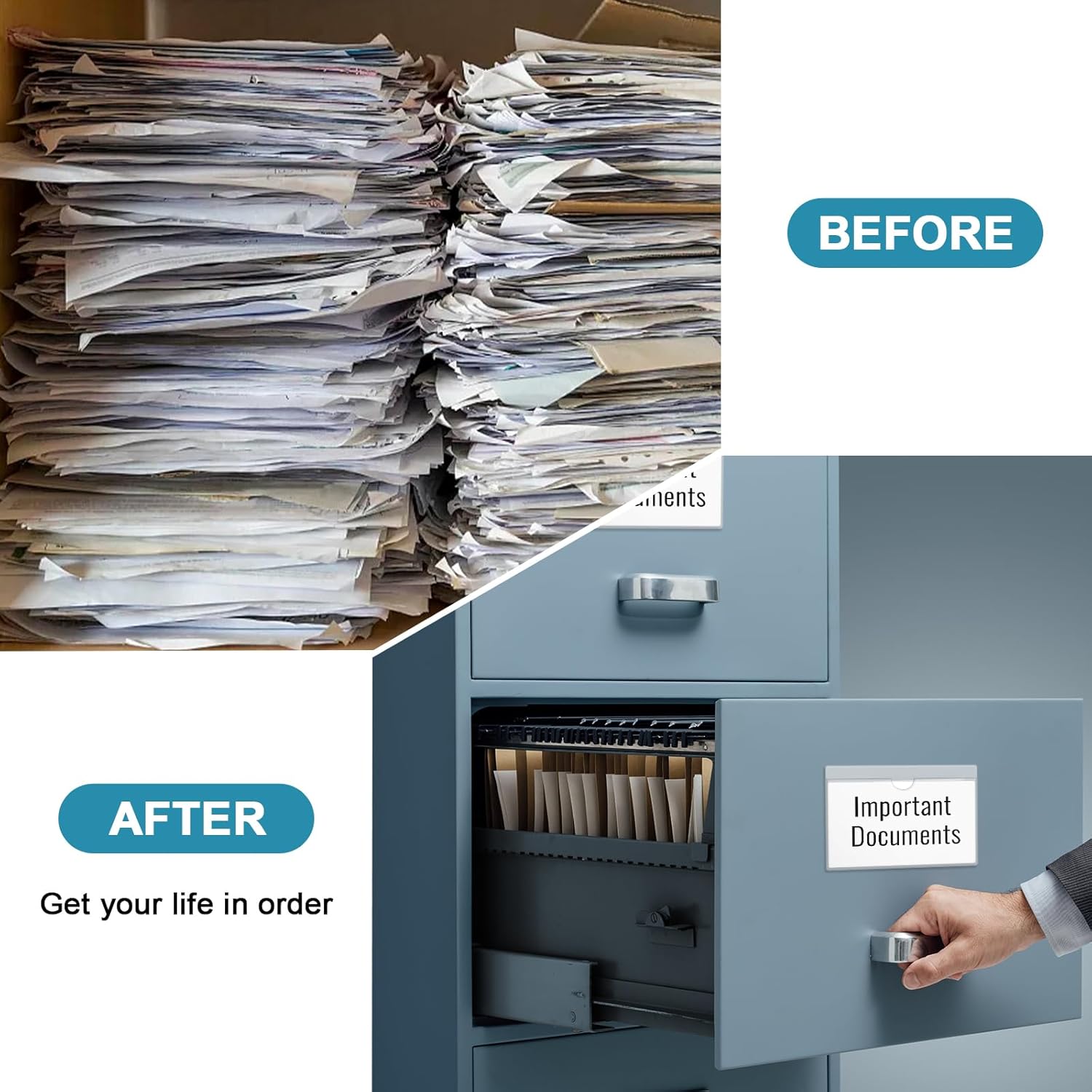 - Self-adhesive: Plastic label holder with a sticky backing, tear off the paper on the back to stick on any smooth surface, easy marking, put index cards, notes, business cards, photos into adhesive index card holders, can be quickly sorted and organized