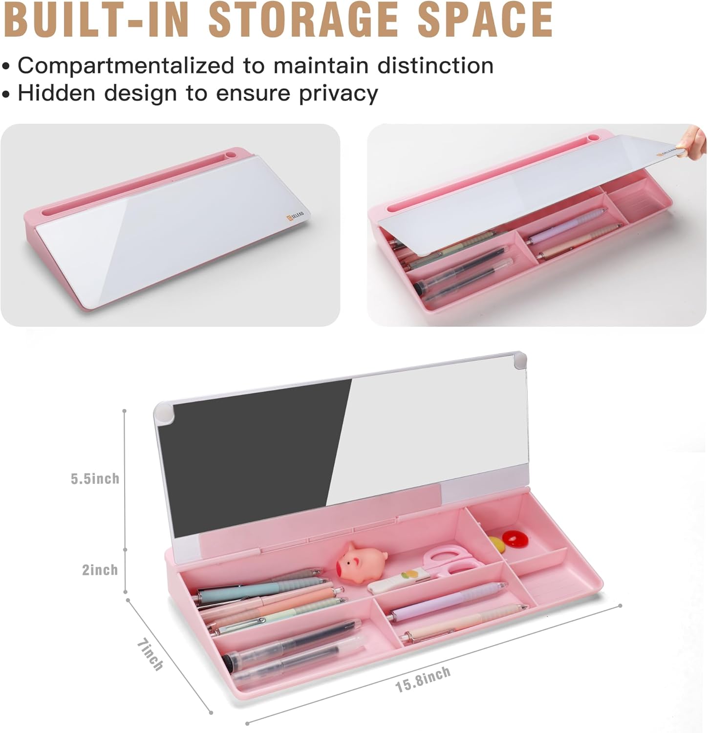 SELEAD Desktop Glass Whiteboard with Organizer & Built-in Mirror - Small Dry Erase White Board Computer Pad Keyboard Stand with Markers, Eraser, Holder for Women Girls - Pink