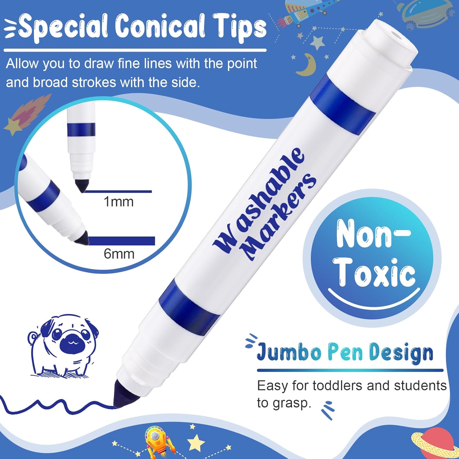 - Versatile Conical Tip Design: the tip of these washable markers adopts a conical design, ideal for coloring empty areas with the sides, and also for drawing thin lines or dots; This can help children fully demonstrate their imagination and creativity