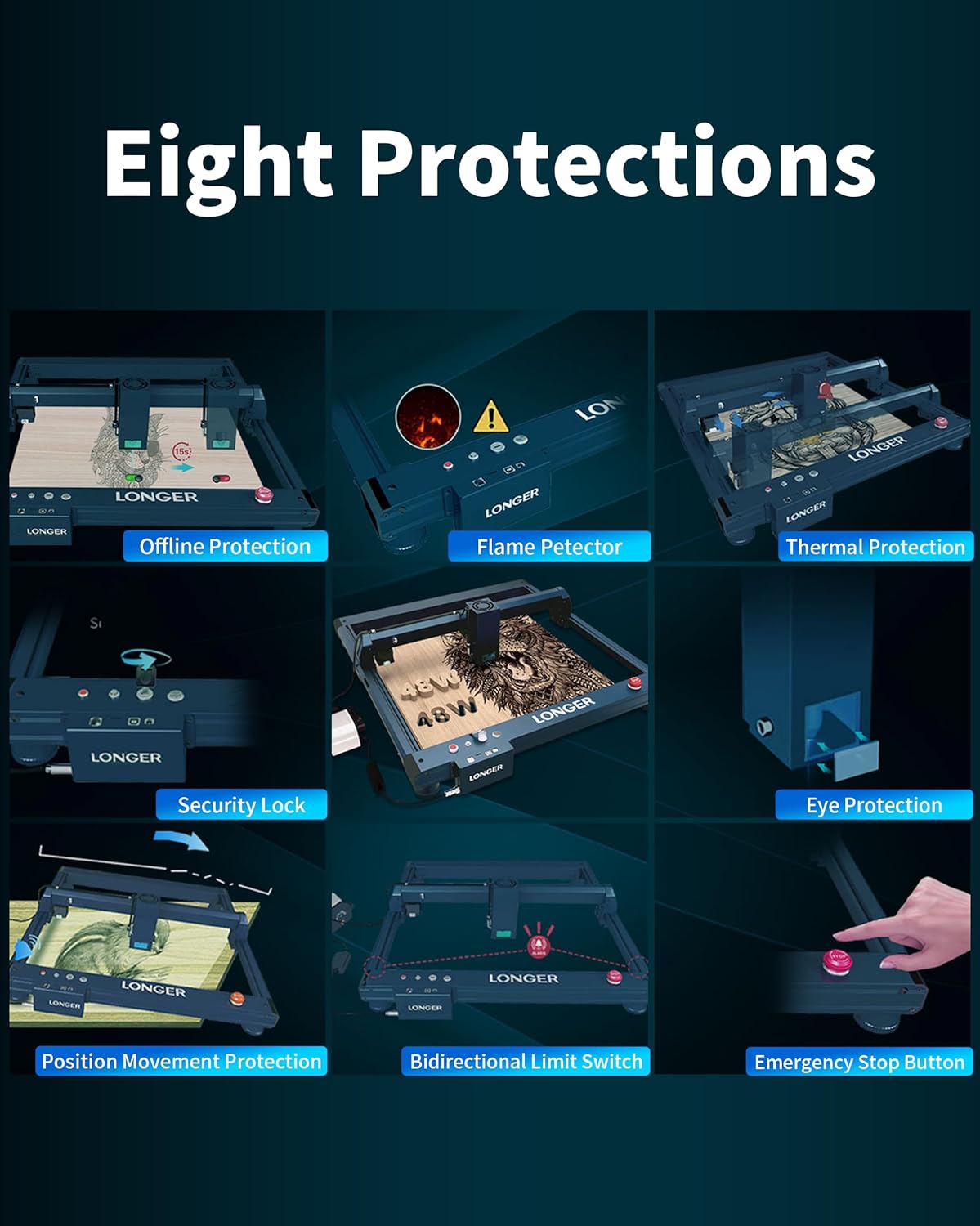- Eight Safety Protection:Safety Lock: Restrict children from using the engraver; Laser Module Panoramic Filter Glass: Block blue light and filter 97% UV to protect eyes; Position Movement Protection: Stop the machine if it moves or tilts during operation; Flame Detector: Prevent wood burning for worry-free engraving; two Way Limit Switch: Alarm-triggered auto zero for laser head protection; Emergency Stop Button: Stop the machine for safety in accidents; Offline Protection; Thermal Protection