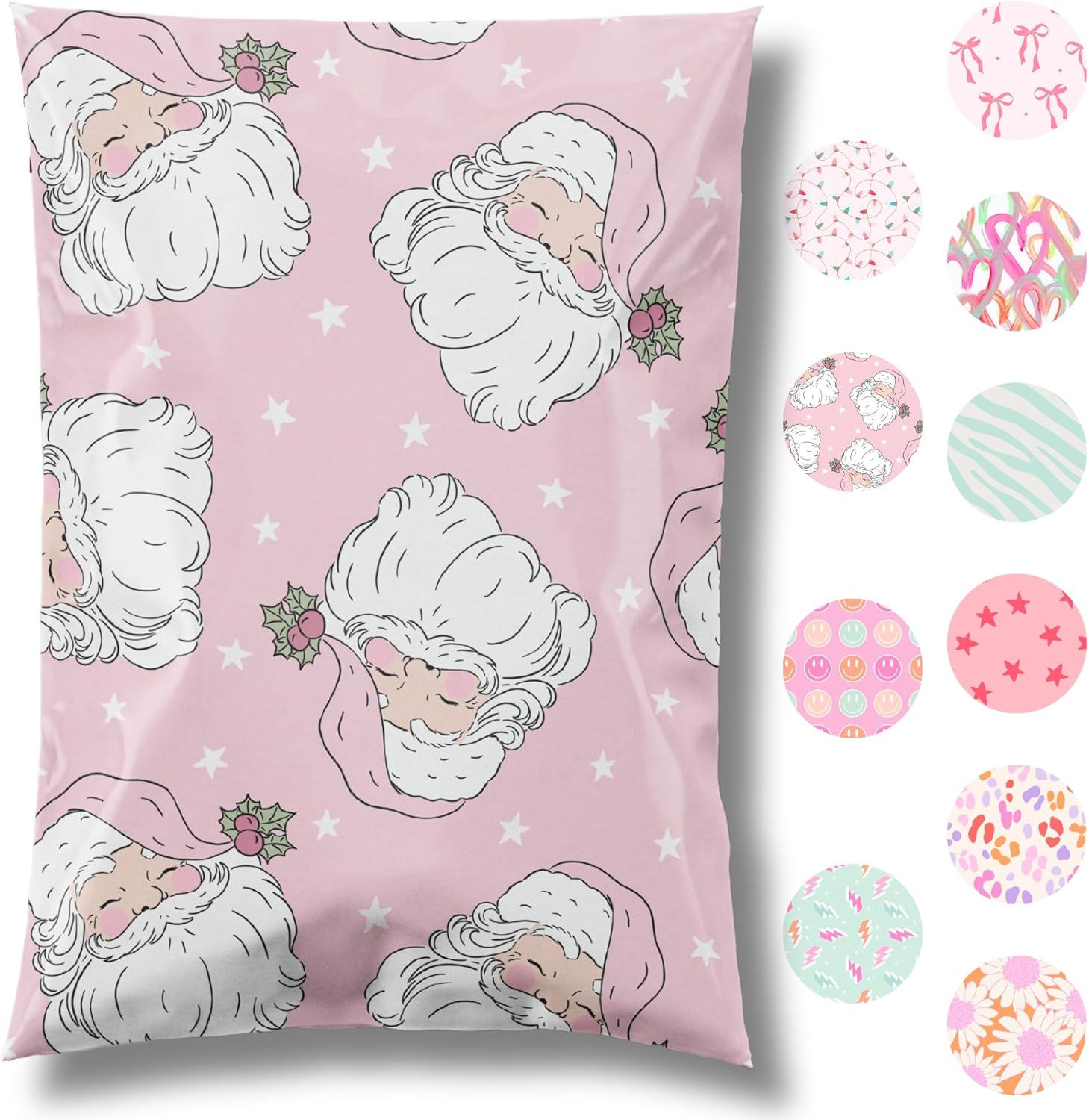 6x9 Designer Christmas Holiday Poly Mailers 100 Pack Heavy Duty Waterproof Self Seal Shipping Bags Large Mailing Envelopes Bulk Tear Resistant Cute Packaging Pink Santa
