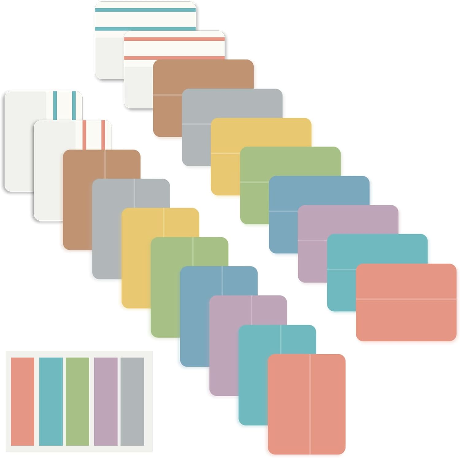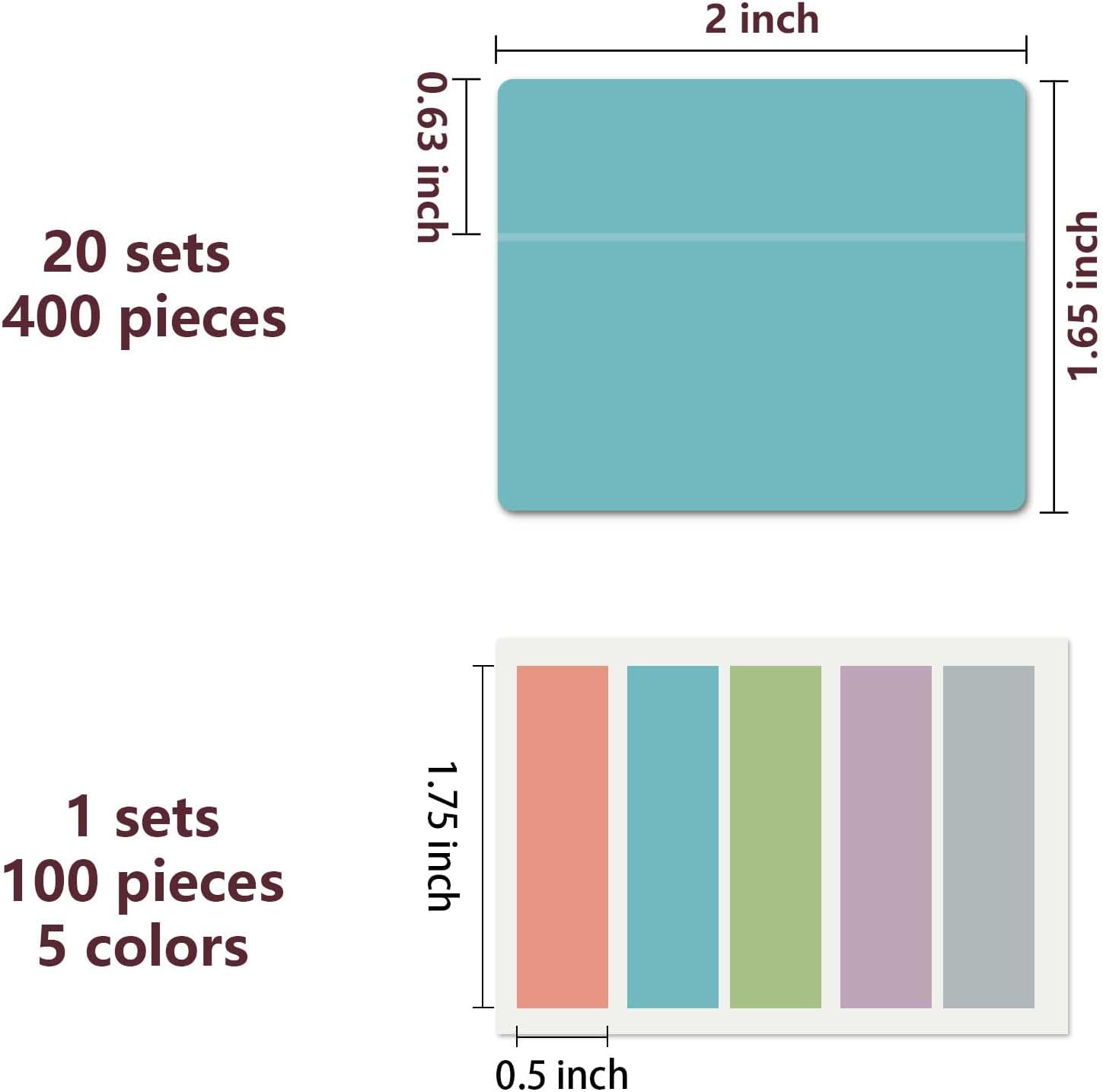 - 500 pieces Tabs: 500 pieces 21 sets in total, 400 pieces 2 inch sticky tabs in 20 sets with different pastle colors,100 pieces 0.5 in tabs in 1sets, 20 pieces each color
