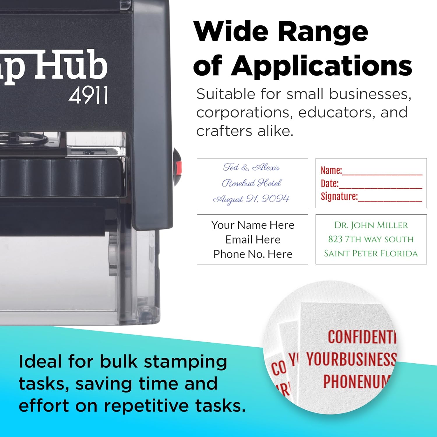 - Self-Inking Technology: Stamp Hub's self-inking stamps offer sharp, crisp prints with every use. Long-lasting ink pads provide thousands of impressions. Hassle-free, clean, and user-friendly, perfect for offices and professionals.