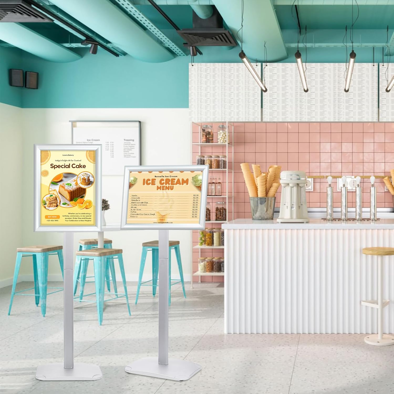 - ✅【180° & 360° Adjustable Views】Our sign stand offers complete flexibility with 180° and 360° adjustable views, allowing you to showcase your posters from any angle.