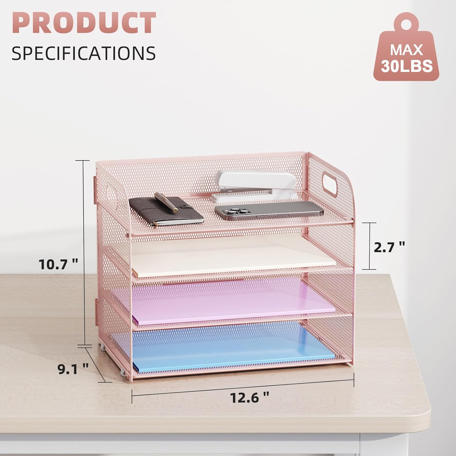 Marbrasse 4 Tier Paper Organizer Letter Tray - Mesh Desk File Organizer with Handle, Paper Sorter Organizer for Letter/A4 Office File Folder Holder (Pink, 12.6" x 9.1" x 10.7")