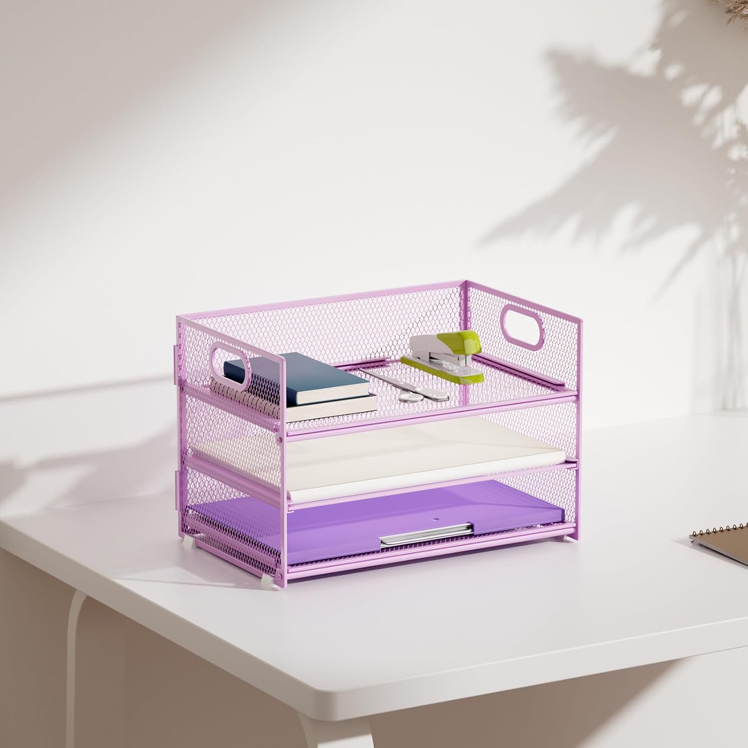 Marbrasse 3 Tier Paper Organizer Letter Tray, Mesh File Organizer with Handle, Paper Sorter Desk Organizer for Home Office Supplies(Purple)