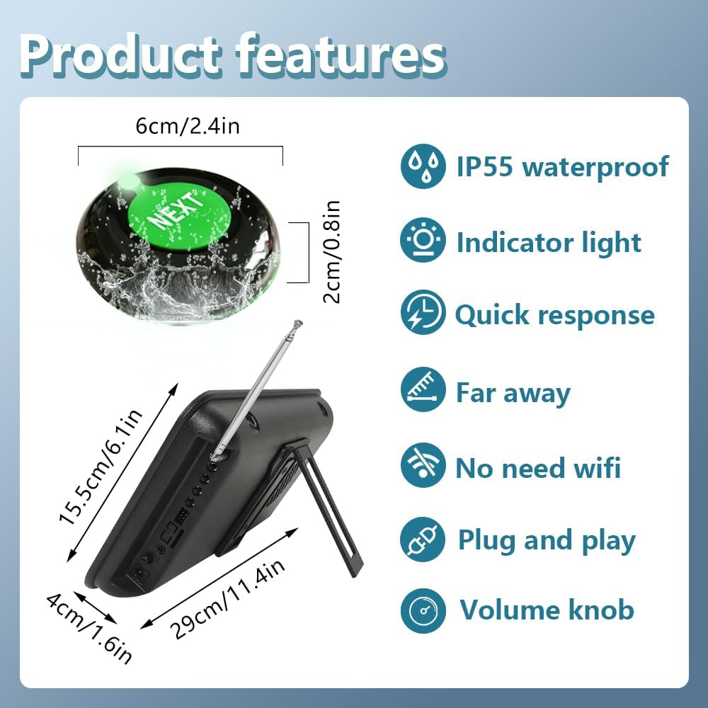 - NEXT Call Button: It is a waterproof signal transmitter for the service personnel. When the "NEXT" button is pressed, the number will automatically go to the next one. It makes our queue calling system simple and easy to use.
