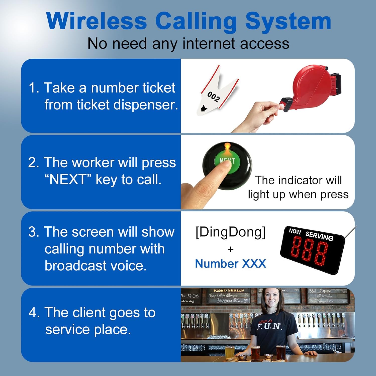 - Take a Number Display: The display receiver can be mounted on a wall or desktop. And The display is adjustable for voice mode, volume and number of prompts. You can choose a simple ding-dong sound or English to remind.