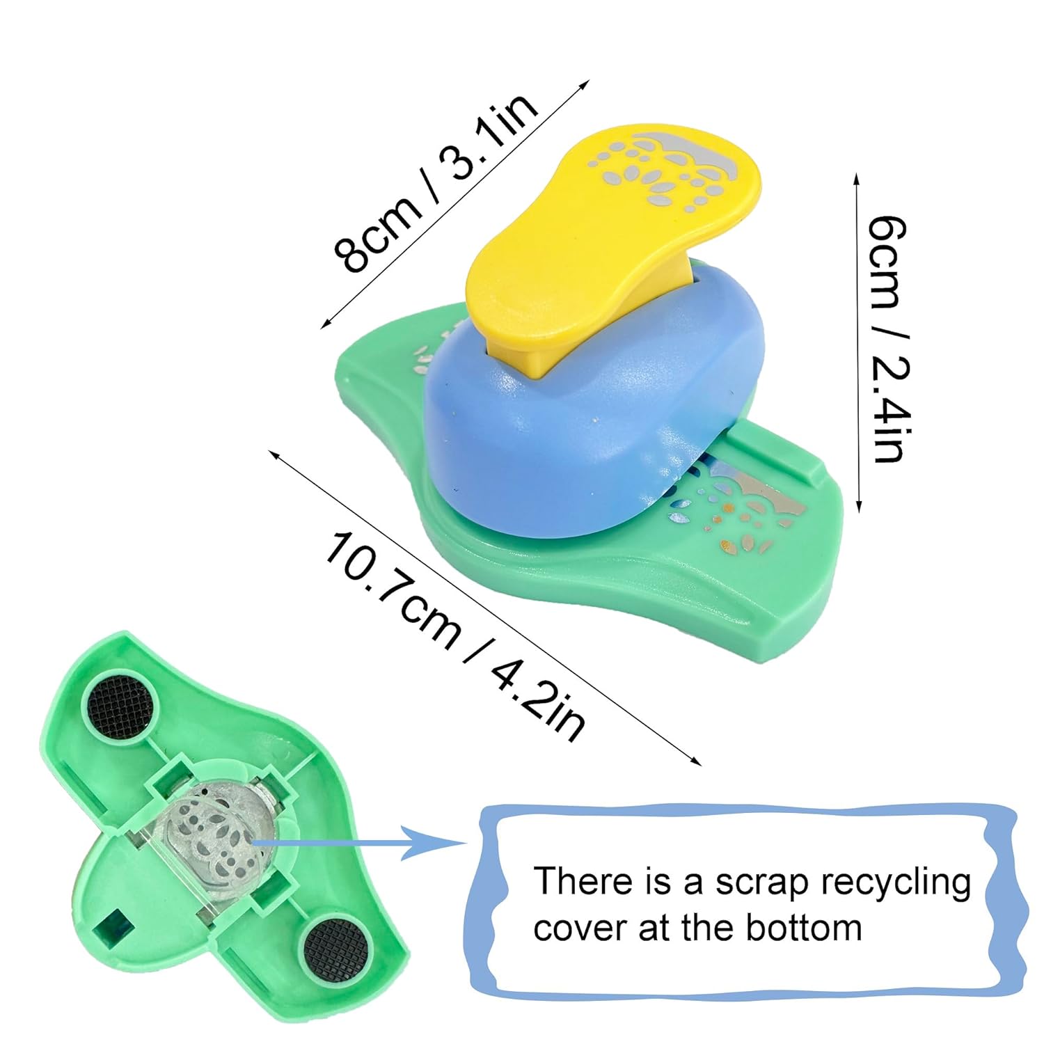 - Product Size: Craft punch Size: 2.3cm x 2cm, shell color is random.Each Craft Punch include a cage to catch the hole scraps to reduce mess.