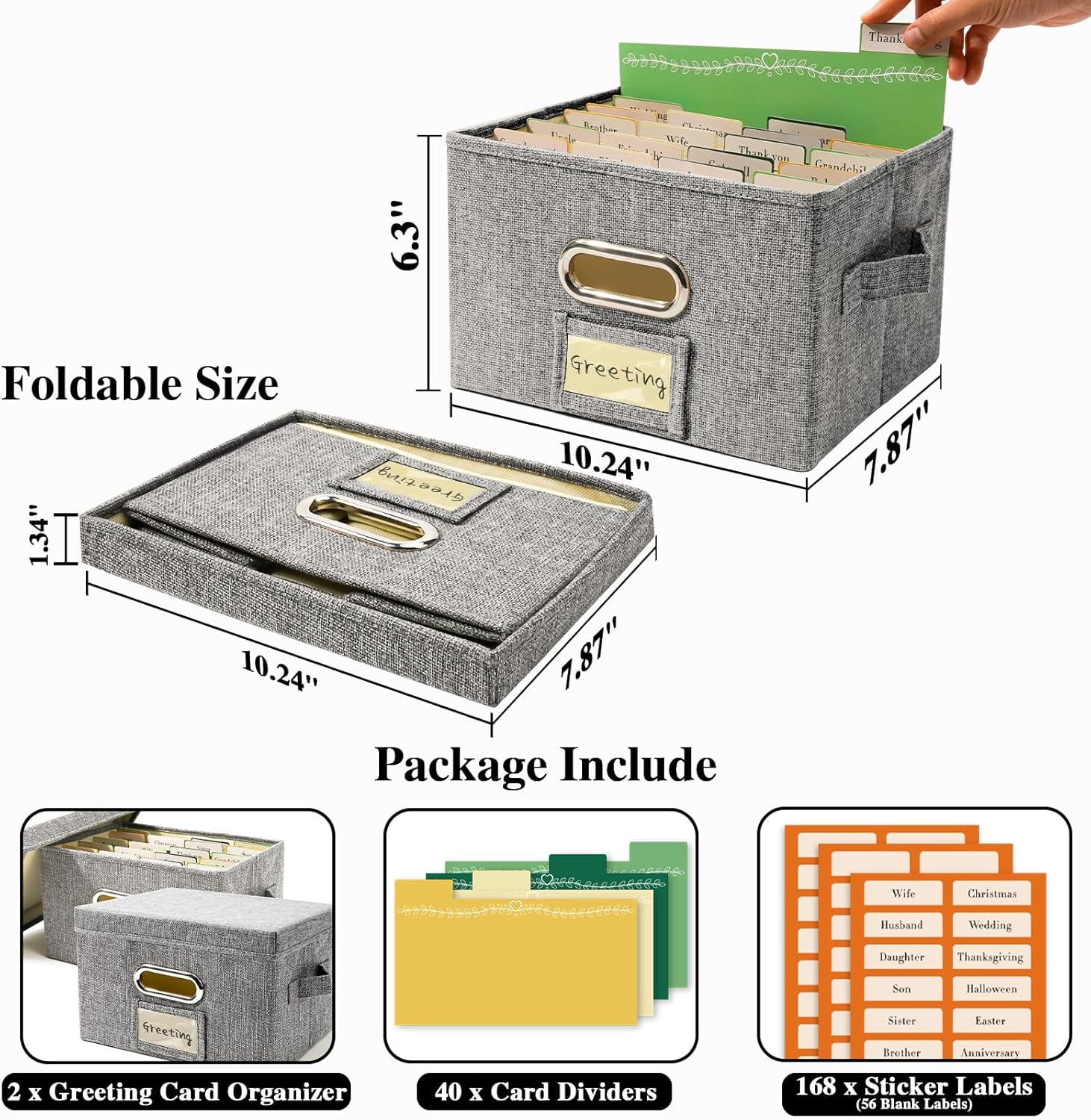 Vienrose Greeting Card Organizer 2 Pack, Storage Box with 20 Adjustable Dividers, Foldable Organizer Box Holds over 150 Cards, Storage Stickers Recipes Photos Envelopes Bills Vinyl Records, Grey