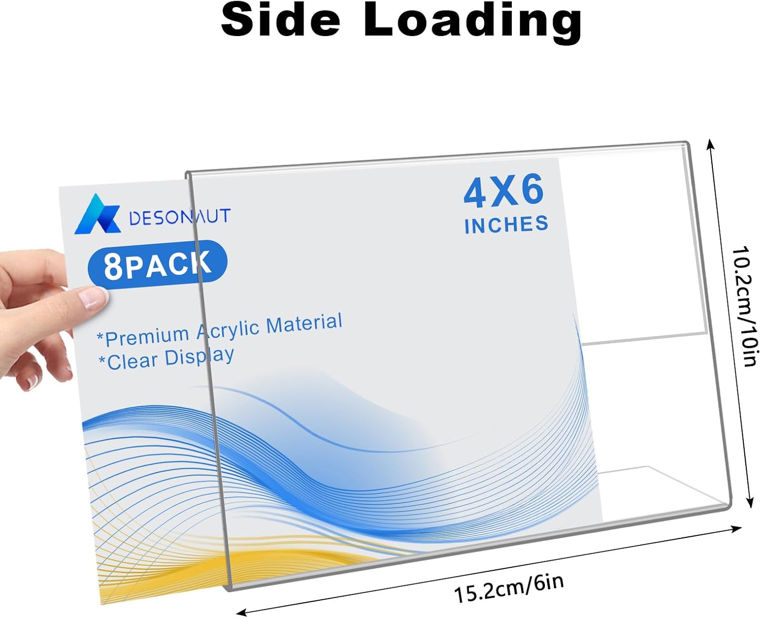 - Included:The package contains 8 pack of 4 x 6 inches(10.2 x 15.2 cm)clear acrylic sign holders,suit for displaying paper,picture.the clear acrylic sign holders is equipped with shock-absorbing bubble bags to prevent damages and sealed in a sturdy box.