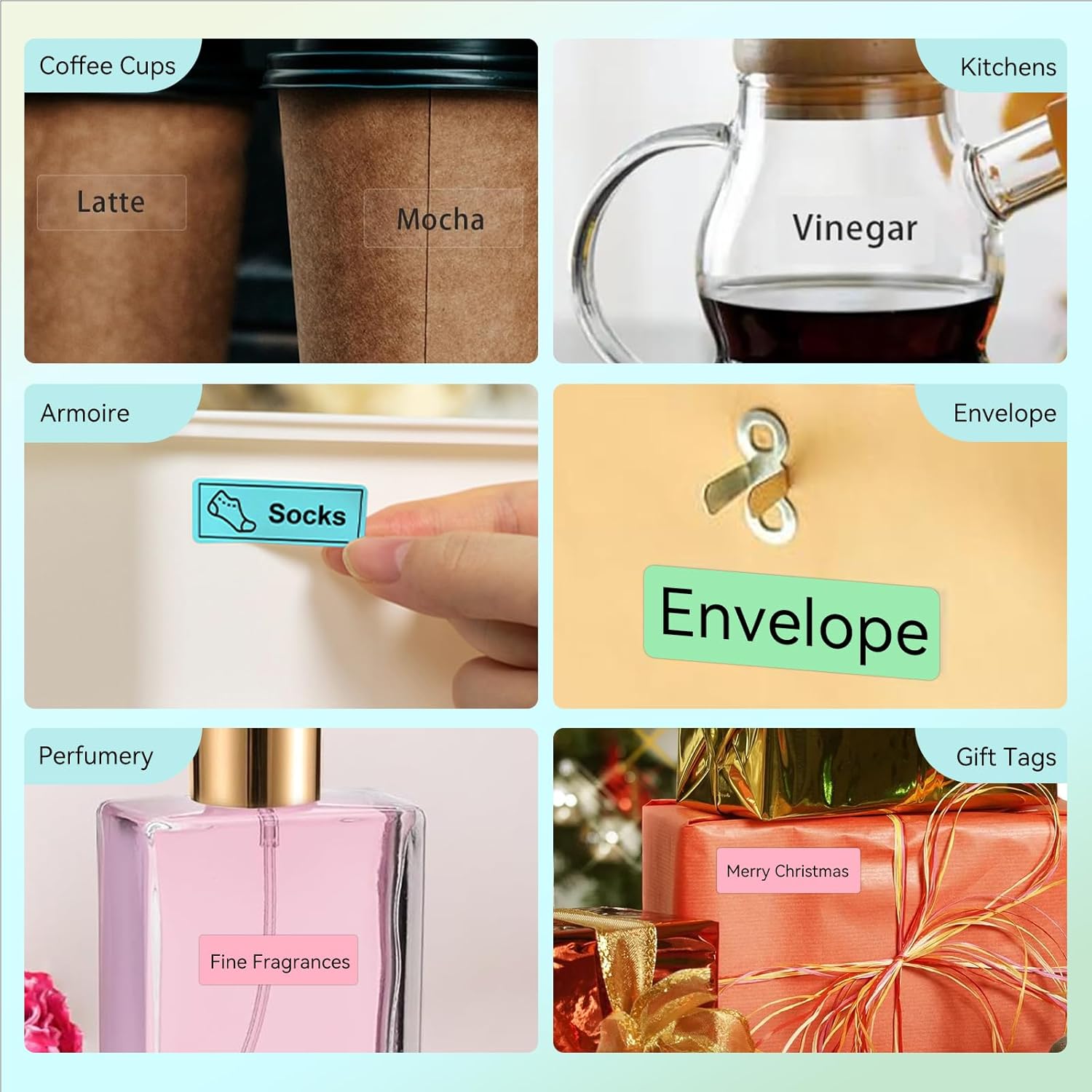 - Label Maker Tape — You could get 10 rolls of labels in total, with sizes 12x40mm (0.47"x1.57"), 165 labels/roll, and 1650pcs in total. 5 Rolls clear, 1 Roll blue, 1 Roll yellow, 1 Roll green, 1 Roll pink, and 1 Roll purple.
