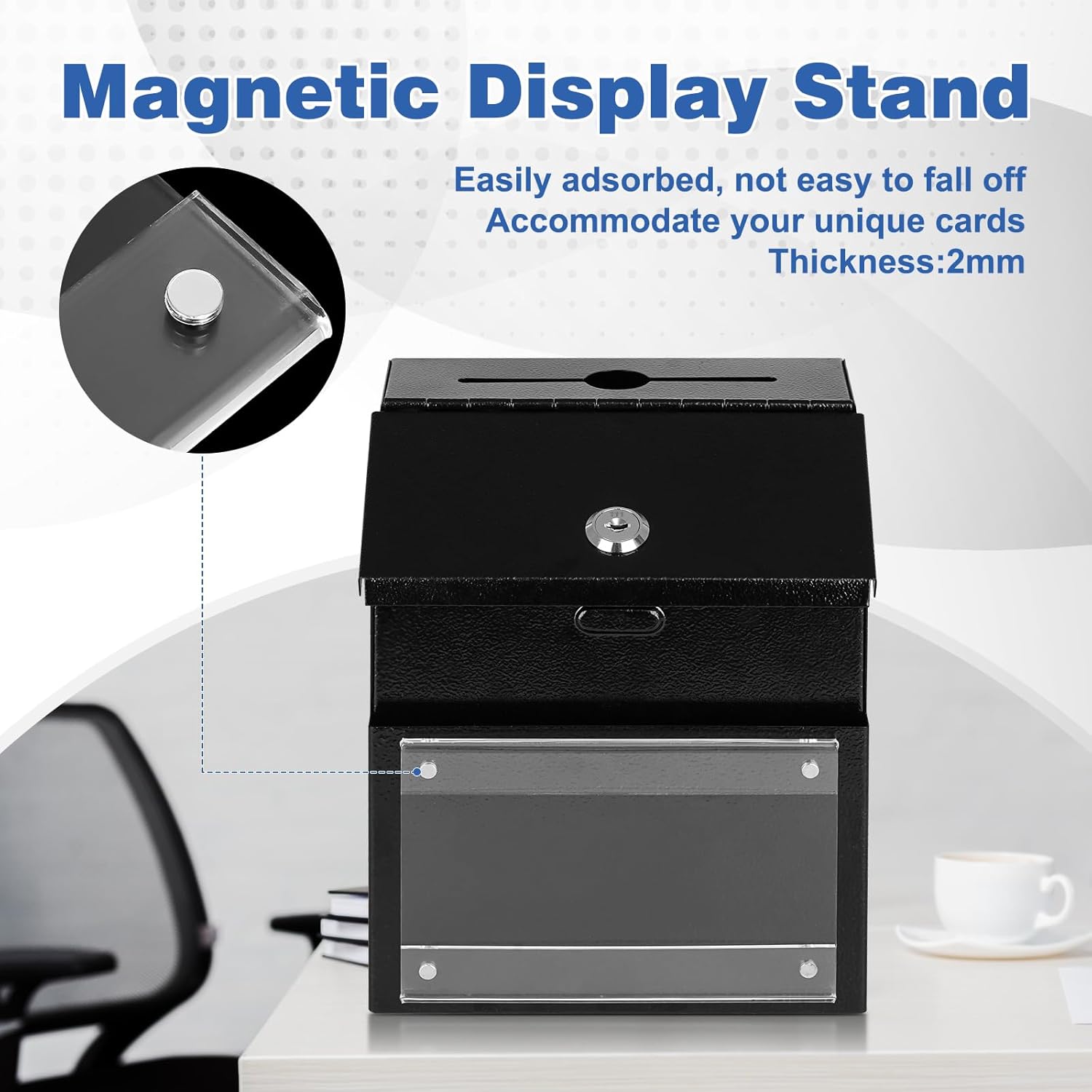 - 【MAGNETIC DISPLAY STAND】The key drop box comes with a magnetic acrylic sign holder and 50 suggestion cards.Removable magnetic display can be directly adsorbed on the suggestion box, strong adsorption, not easy to fall off.You can customize your display, design it yourself or use markers, stickers, etc. to achieve your own creative ideas.