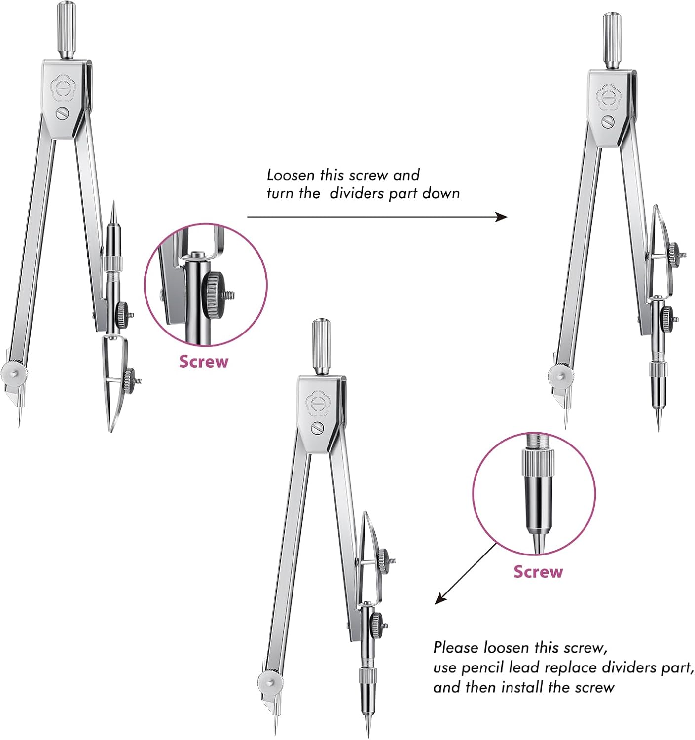 - Warm notice: if you receive the product and found the screw of compass is loose, do not worry, it is not a quality problem; The loose screw makes it easier for you to turn the pencil down; You can tighten the screw after using pencil replace divider part