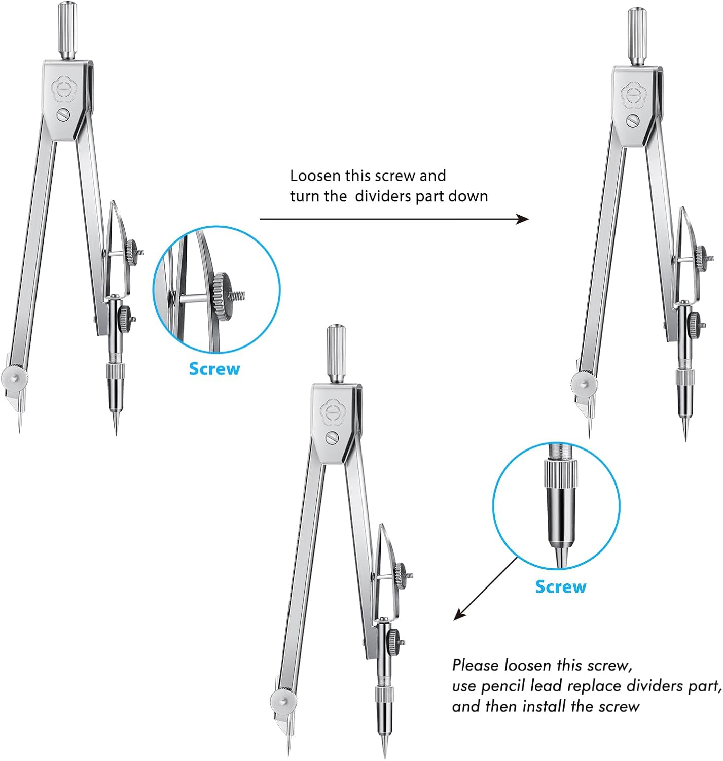 - Warm notice: if you receive the product and found the screw of compass is loose, do not worry, it is not a quality problem; The loose screw makes it easier for you to turn the pencil down; You can tighten the screw after using pencil replace divider part