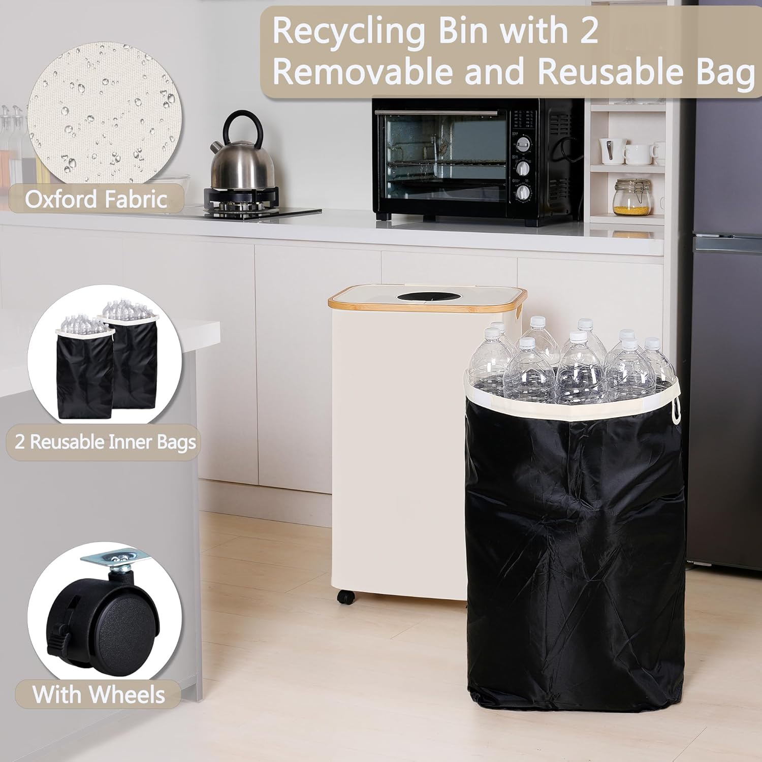 efluky Recycle Bins for Kitchen 100L (26 Gallon), Recycling Bin with Wheels and 2 Removeable and Reusable Inner Bags, Kitchen Recycling bin with lid for Bottle Can Plastice Stickers, Beige